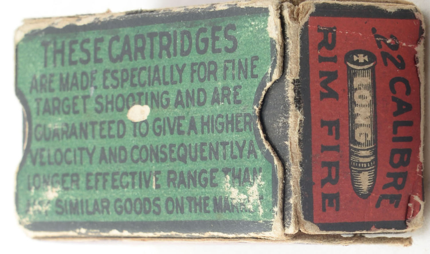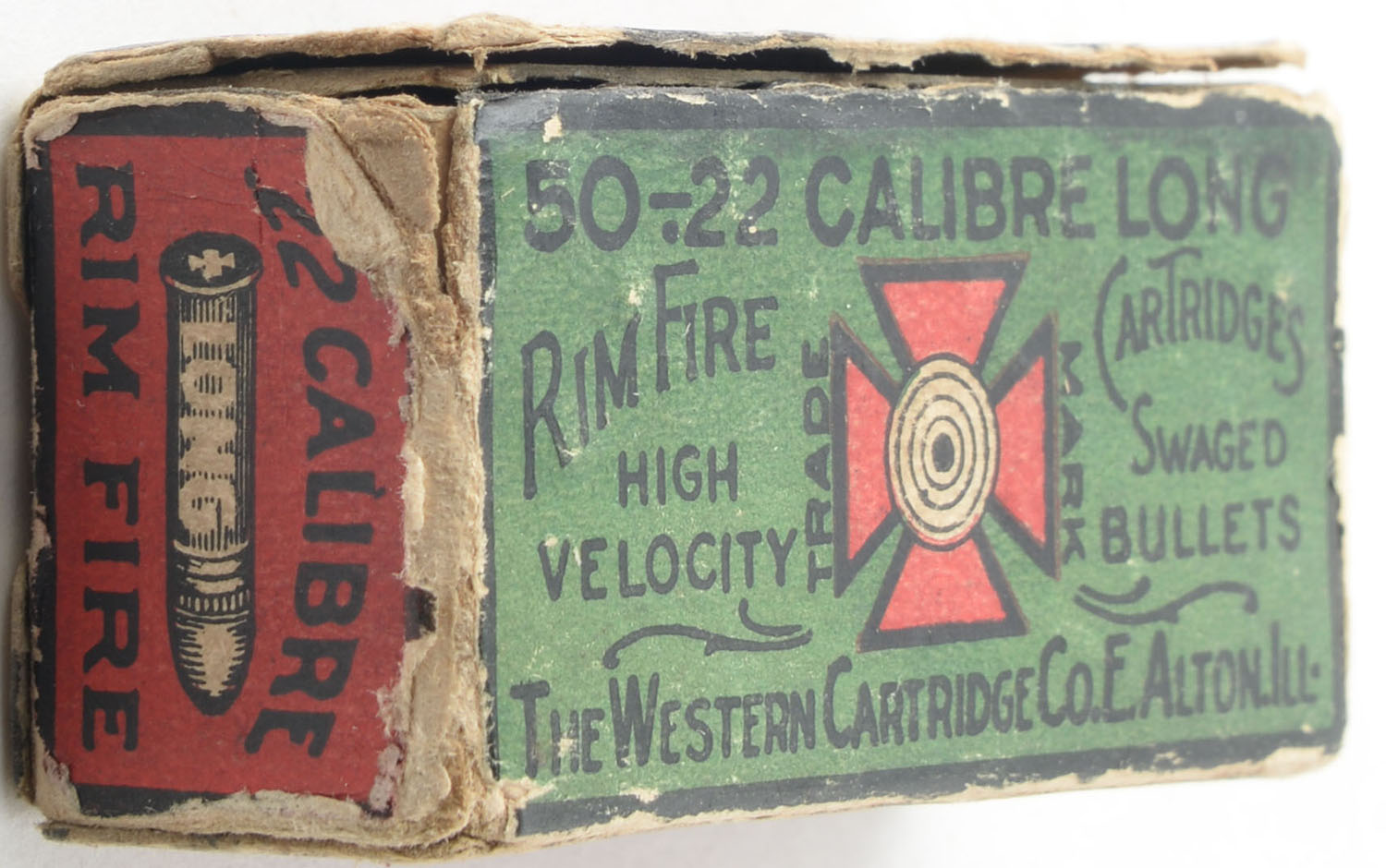 Western, Rim Fire Cartridges, .22 Long, High Velocity, Swaged Bullets, Full, 1pc. Green red & black box, seam split to top back edge, very good color, some age soiling, edge & corner wear, end flaps are solid, ammo is good. Grade: Good - Value: 50 to 75