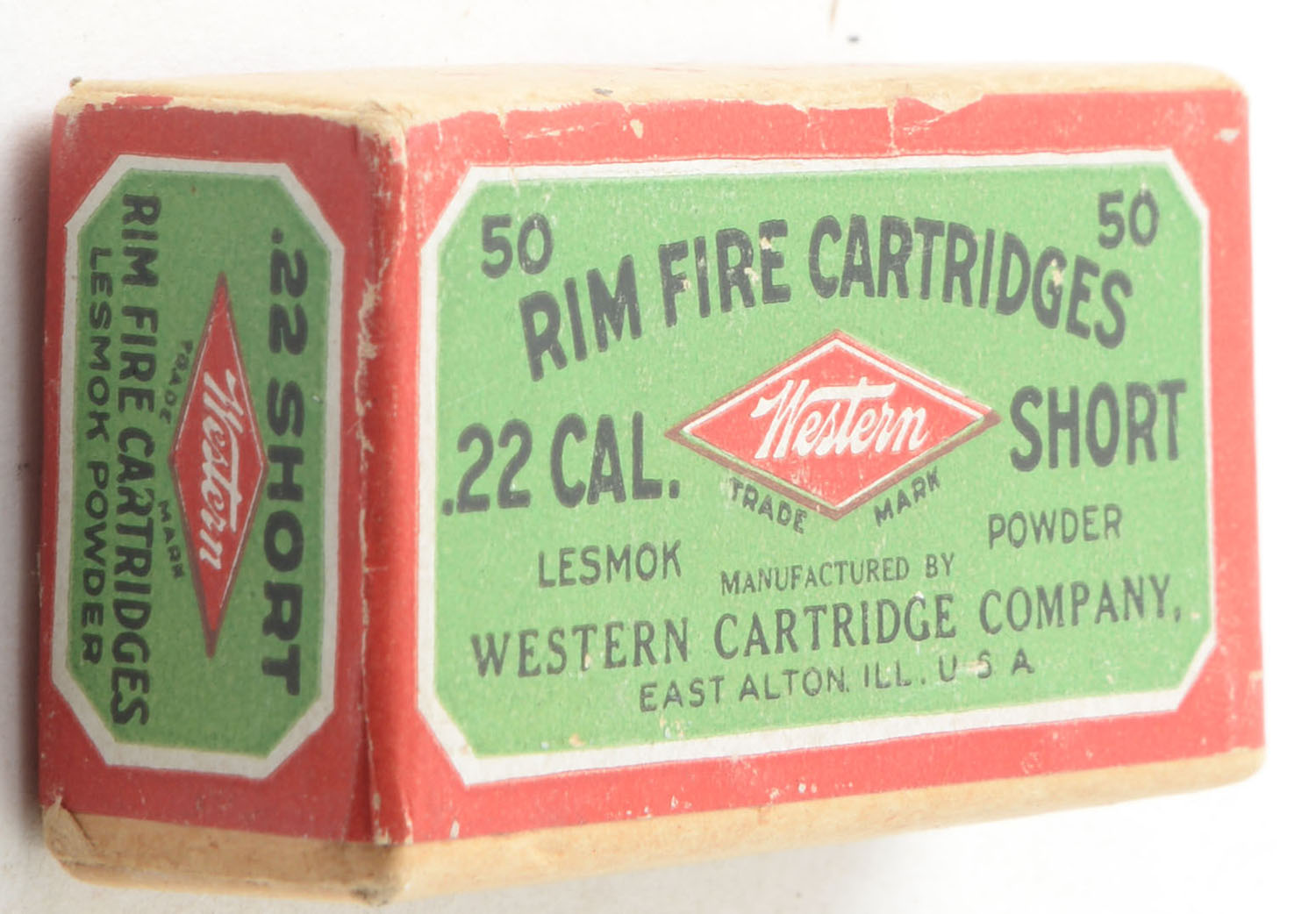 Western, .22 Short, Lesmok Powder, RHWeb: WCC-3 S-2b, FULL & SEALED, 2pc. Buff box with green & red wraparound label, box is solid with excellent color, very minor shelf wear, edges are crisp, corners are mostly sharp, label is intact. Grade: Excellent + - Value: 100 to 150
