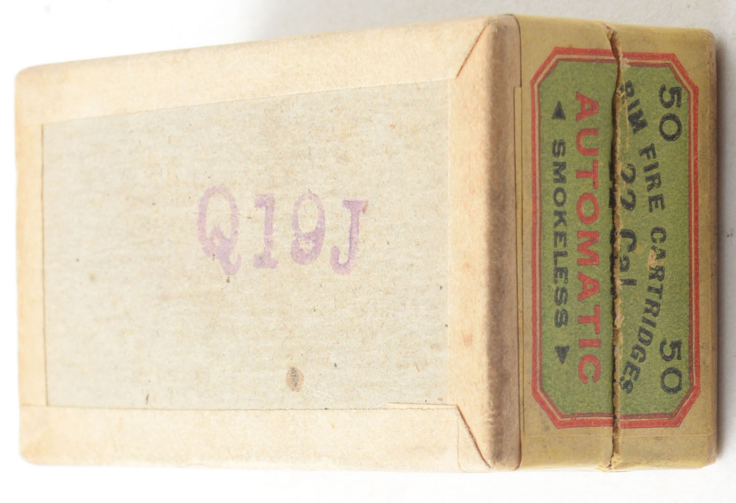 Western, Rim Fire Cartridges, .22 Winchester Automatic, Smokeless Powder, RHWeb: WCC-3 WA-1.1, Full, 2pc. Buff box with green/red top & side sealing labels, box is solid with very good color, some age soiling, very minor corner wear, edges are crisp, labels are intact, ammo is excellent. Grade: Very Good ++ - Value: 70 to 100