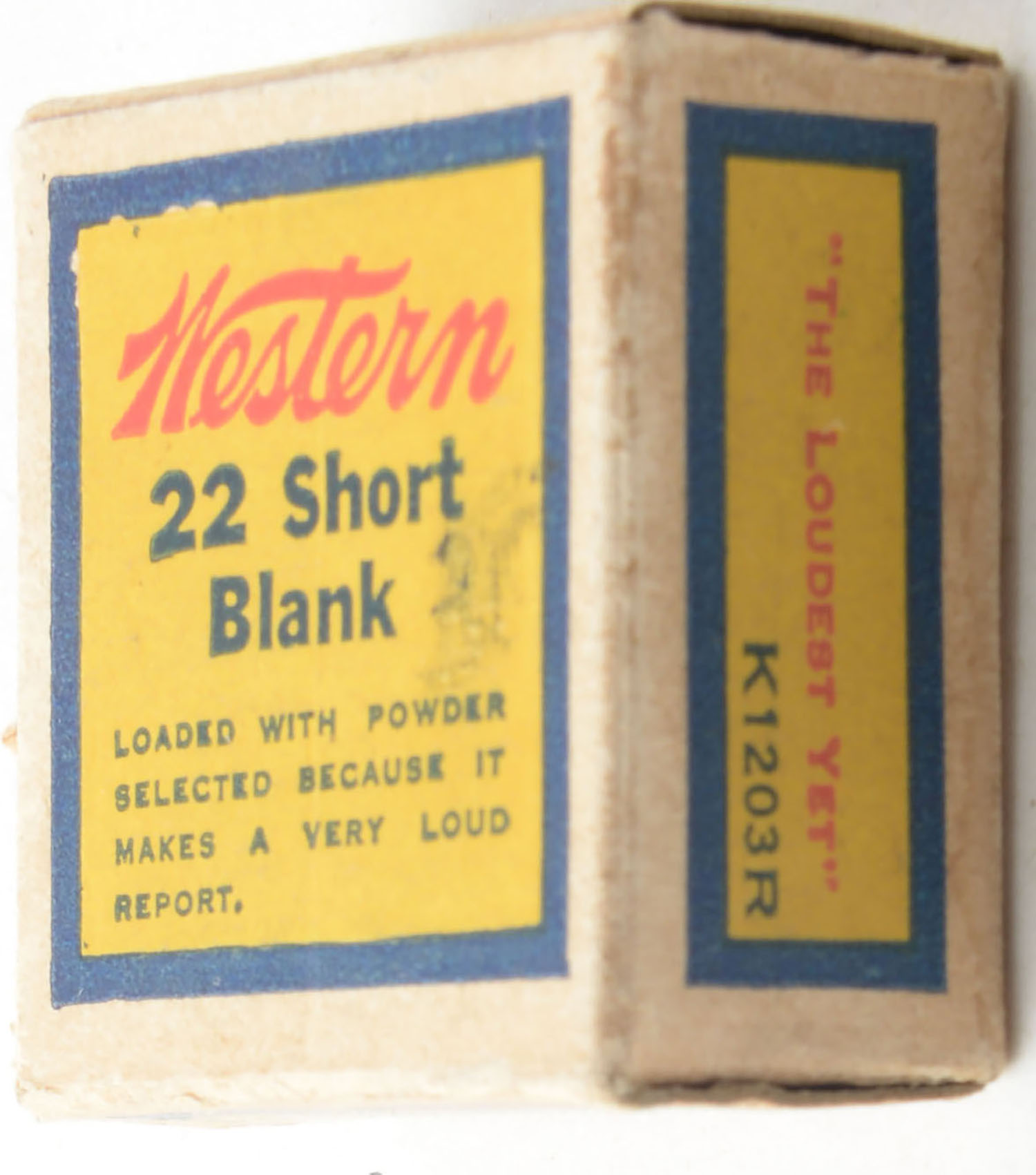 Western, Rim Fire Cartridges, .22 Short Blank, RHWeb: WCC-4.3B S-1c, Partial approx 3/4 full, 1pc. Yellow blue & red printing on a buff box, box is solid with excellent color, very minor age soiling, minor edge & corner wear, top flap is solid, ammo is very good. Grade: Excellent - Value: 10 to 15
