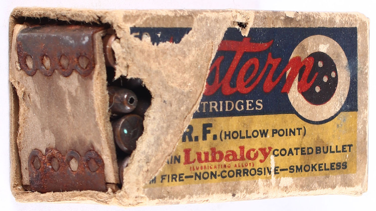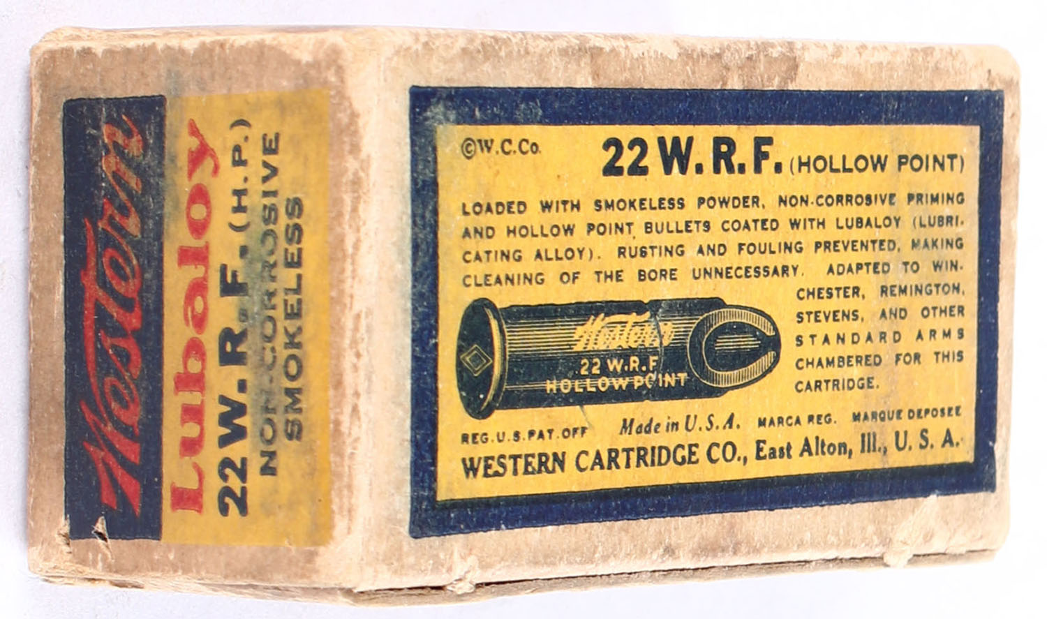 Western, Rim Fire Cartridges, .22 W.R.F. Hollow Point, Lubaloy Coated Bullet, RHWeb: WCC-4.4 WRF-2, Full, 1pc. Yellow blue & red bulls eye box, missing left end flap, tear on top, fair color, age soiling, shelf wear, edge & corner wear, right end flap is solid, ammo is very good. Grade: Fair + - Value: 20 to 30