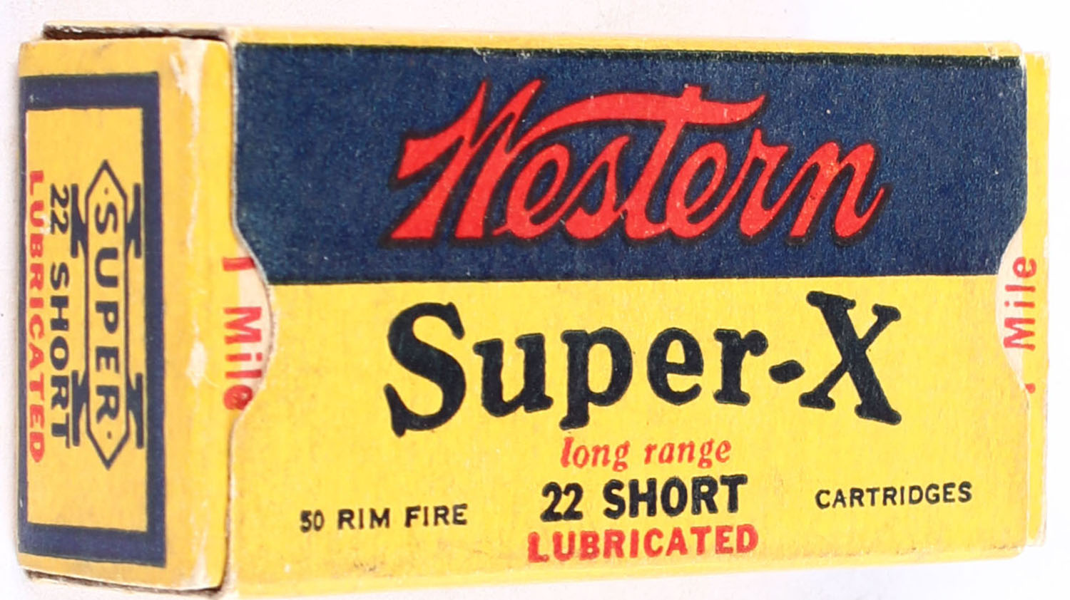 Western, Super-X, .22 Short, Lubricated, RHWeb: Super-X-Shorts-13 S-23, Full, 1pc. Yellow blue & red box, box is solid with excellent color, very minor age soiling & corner wear, edges are mostly crisp, end flaps are solid, ammo is excellent. Grade: Excellent - Value: 20 to 30