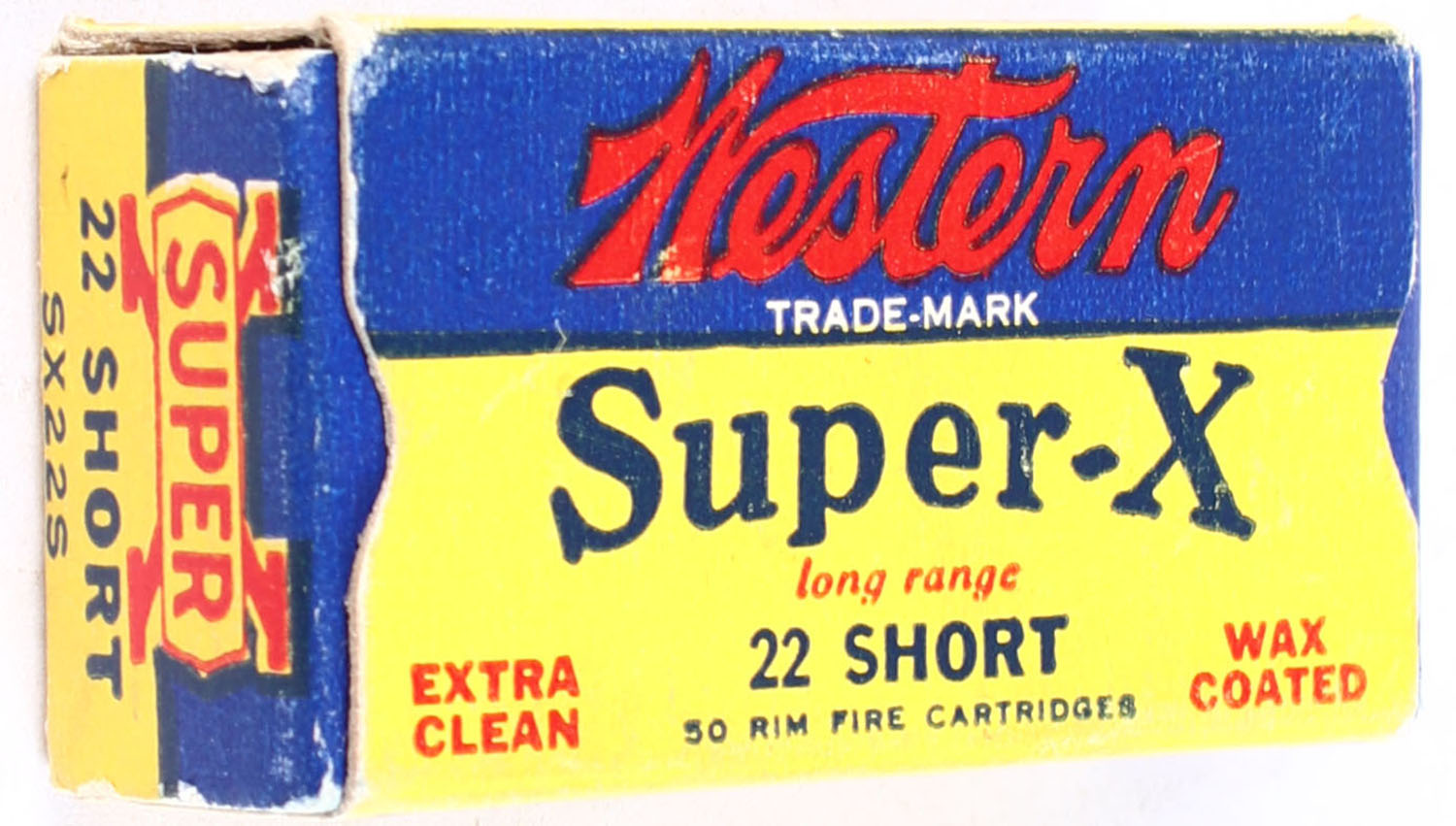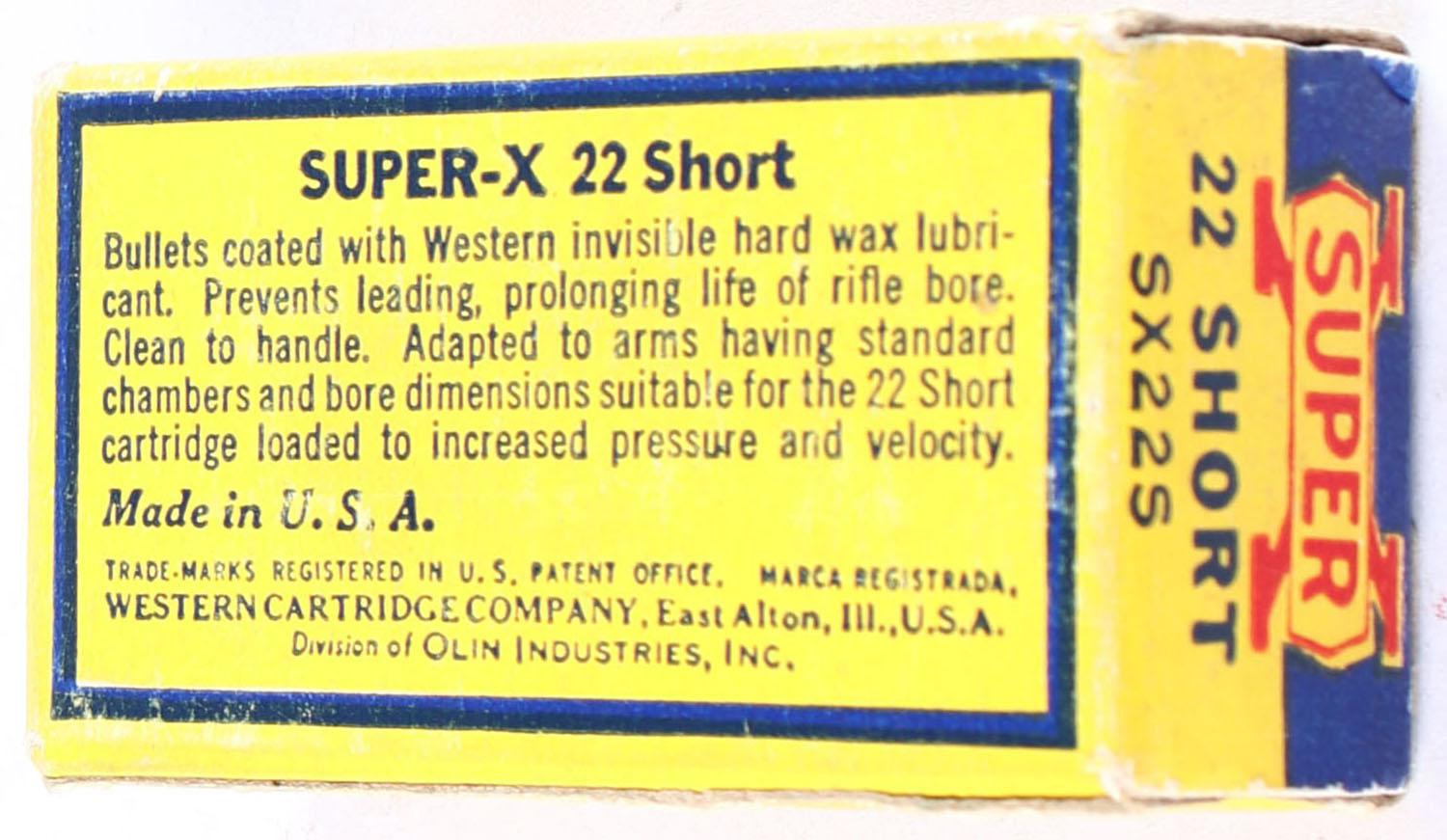 Western, Super-X, .22 Short, Extra Clean Wax Coated, RHWeb: Super-X-Shorts-8 S-15, Full, 1pc. Yellow blue & red box, box is solid with very good to excellent color, minor age soiling, very minor shelf & corner wear, edges are crisp, end flaps are solid, ammo is excellent. Grade: Excellent - Value: 6 to 10