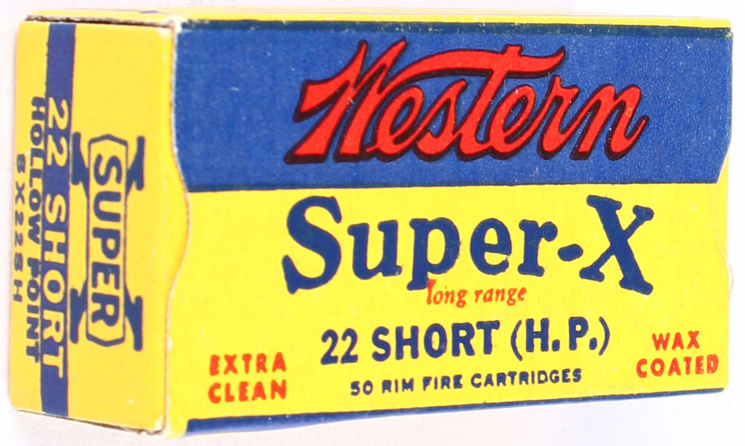 Western, Super-X, .22 Short Hollow Point, Extra Clean Wax Coated, RHWeb: Super-X-Shorts-31 SHP-25, Full, 1pc. Yellow blue & red box, box is MINT with minty color, corners are sharp, edges are crisp, end flaps are solid, ammo is excellent to minty. Grade: MINT - Value: 20 to 30