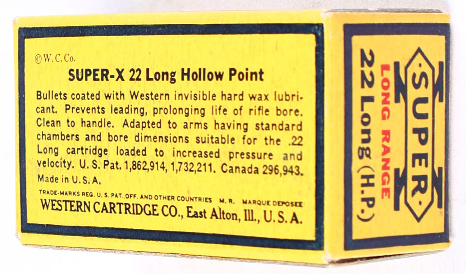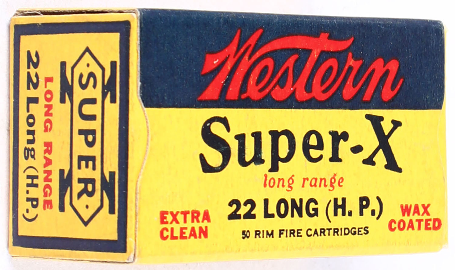 Western, Super-X, .22 Long Hollow Point, Extra Clean Wax Coated, RHWeb: Super-X-Longs-20 LHP-7, Full, 1pc. Yellow blue & red box, box is solid with excellent color, very minor age soiling, corners are mostly sharp, edges are crisp, end flaps are solid, ammo is minty. Grade: Excellent + - Value: 50 to 75
