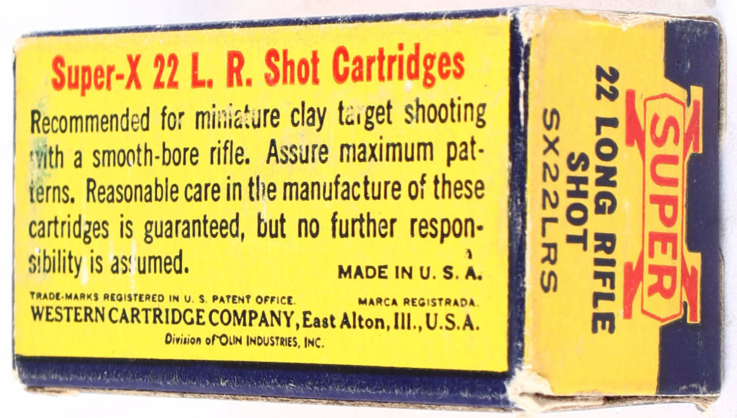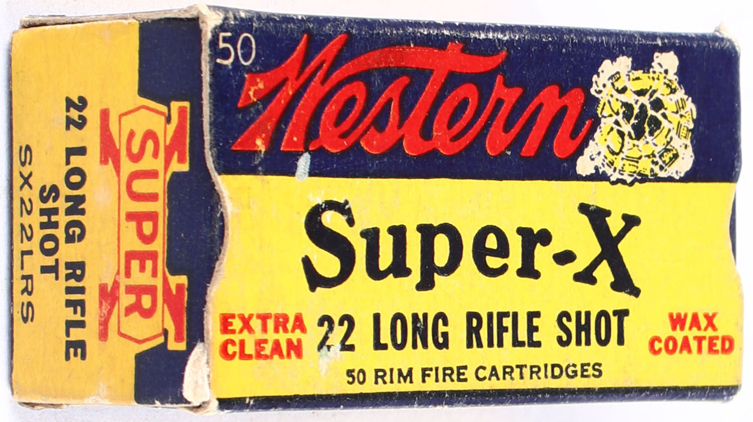 Western, Super-X, .22 Long Rifle Shot, Extra Clean Wax Coated, RHWeb: Super-X-Long Rifle-47 LRS-17, Partial 41rds., 1pc. Yellow blue & red box, box is solid with excellent color, minor shelf & corner wear, edges are mostly crisp, end flaps are solid, ammo is excellent. Grade; Very Good ++ - Value: 8 to 12