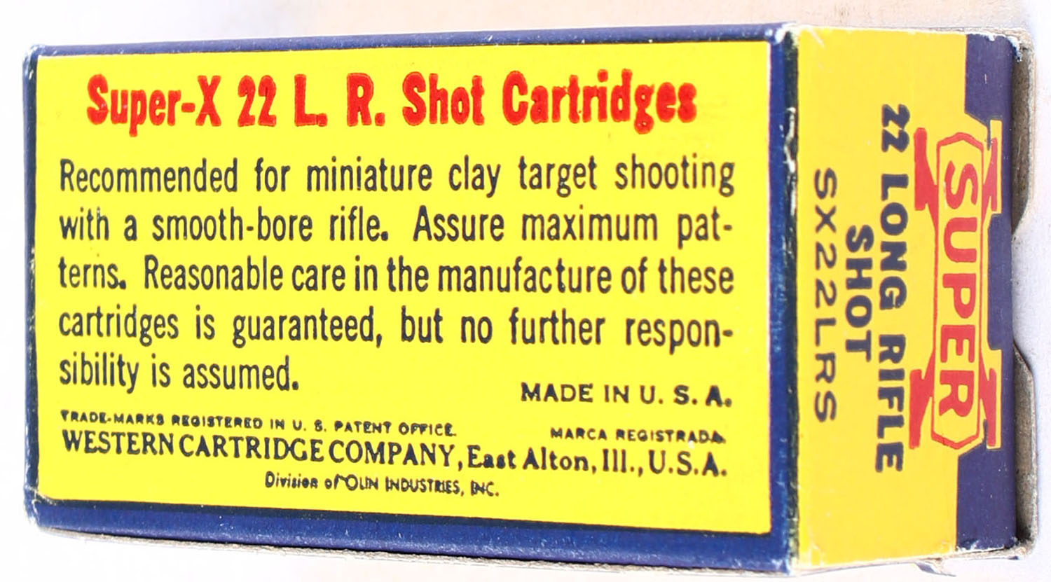 Western, Super-X, .22 Long Rifle Shot, Extra Clean Wax Coated, RHWeb: Super-X-Long Rifle-48 LRS-20, Full, 1pc. Yellow blue & red box, box is MINT with minty color, corners are mostly sharp, edges are crisp, end flaps are solid, ammo is excellent. Grade: MINT - Value: 30 to 45