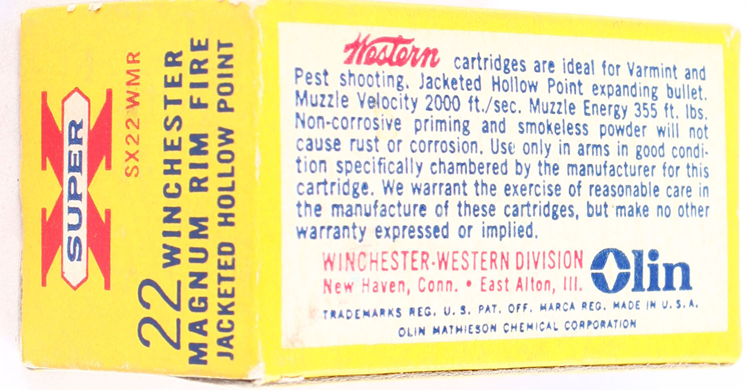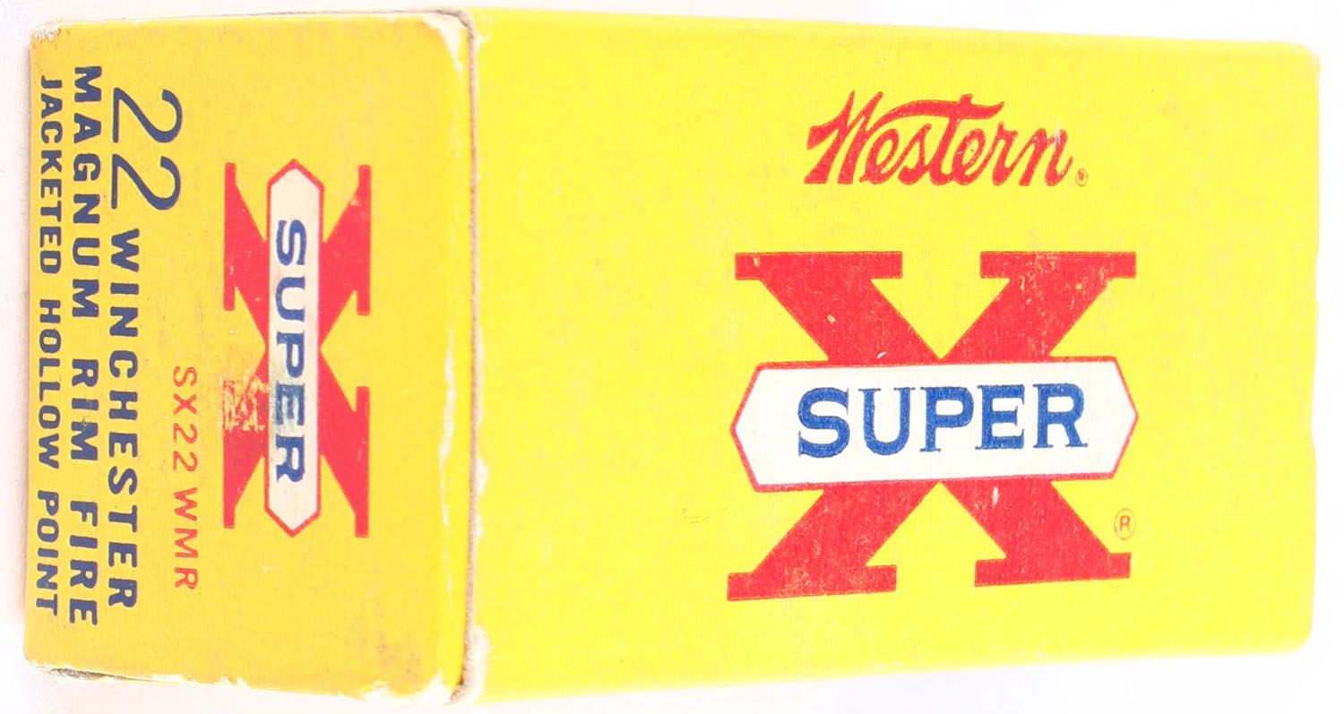 Western, Super X, .22 Winchester Magnum, 40 Grain Jacketed Hollow Point, RHWeb: WCC-11 WMR-2, Full, 1pc. Yellow white & red box, box is solid with excellent color, minor age soiling, very minor shelf & corner wear, edges are mostly crisp, end flaps are solid, ammo is excellent. Grade: Excellent - Value: 16 to 24