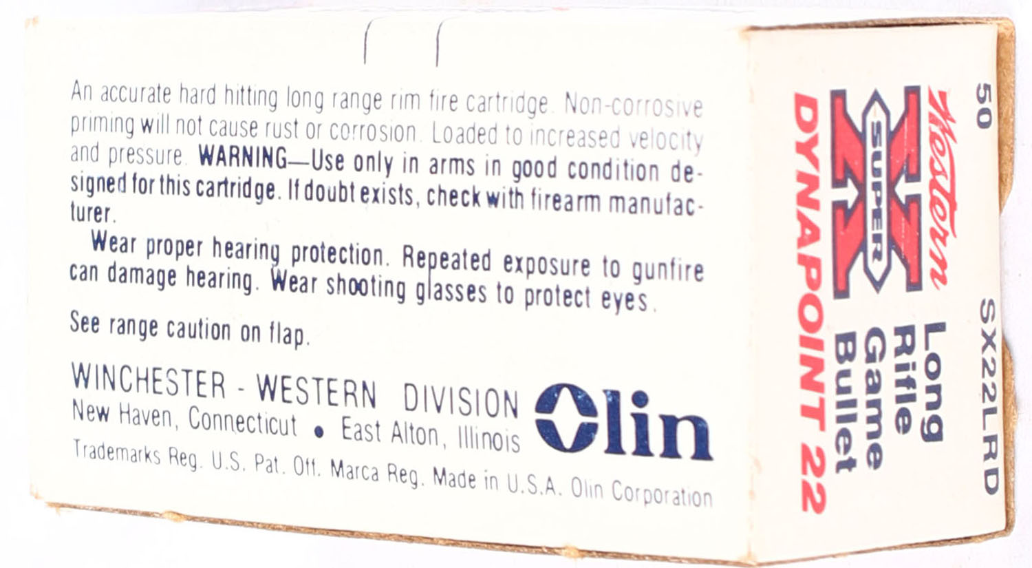 Western, Super X, .22 Long Rifle, Dynapoint, Extra Power, RHWeb: WCC-15 LR-4, Full, 1pc. White red & black box, box is solid with excellent color, minor shelf wear, very minor corner wear, edges are mostly crisp, end flaps are solid, ammo is excellent. Grade: Excellent - Value: 10 to 15