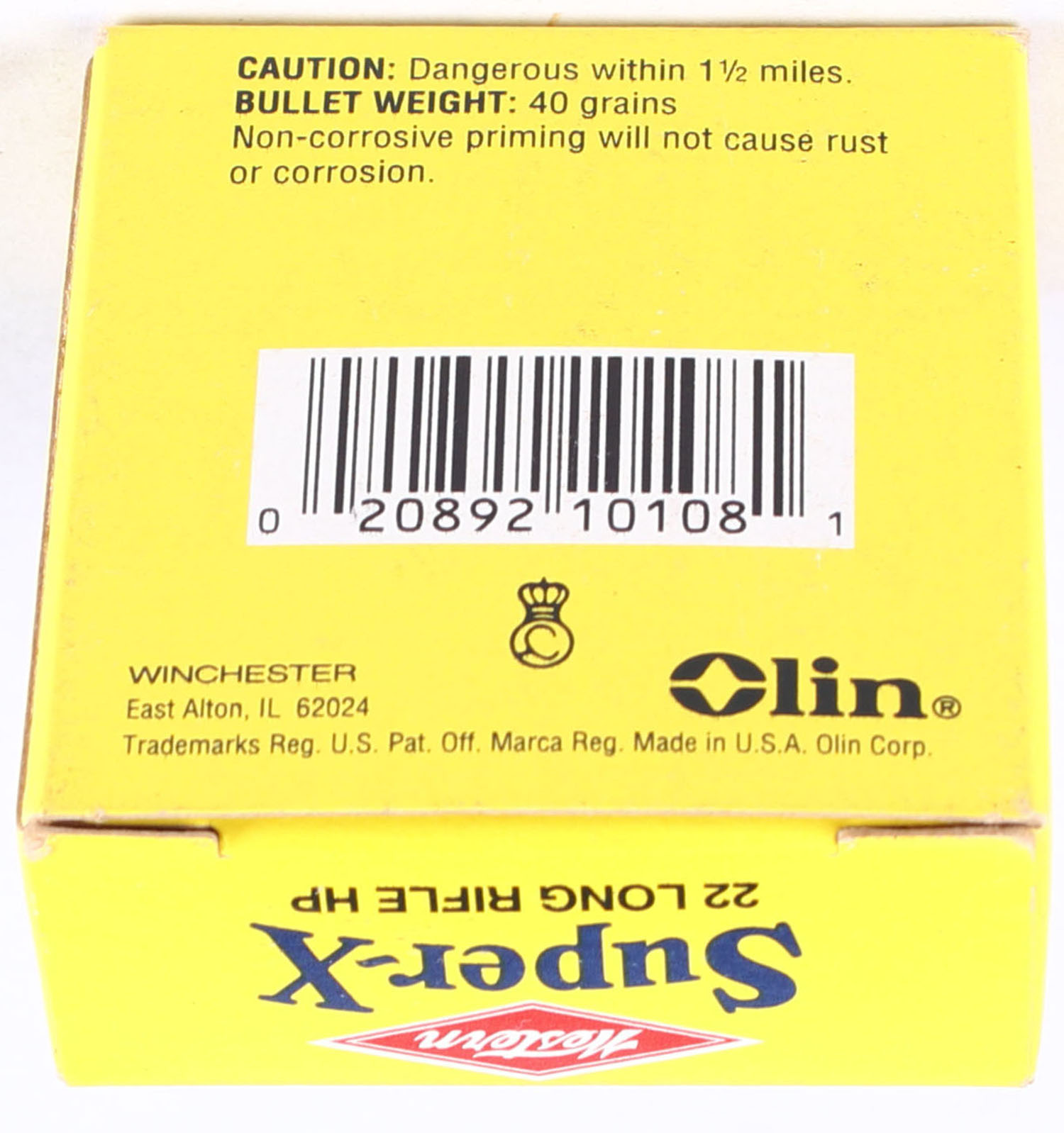 Western, Super-X, .22 Long Rifle Hollow Point, 40 Gr. Hollow Point, RHWeb: WCC-99 LR-2, Full, 1pc. Yellow black & red box, box is solid with excellent color, very minor corner wear, edges are crisp, end flaps are solid, ammo is excellent. Grade: Excellent + - Value: 20 to 30
