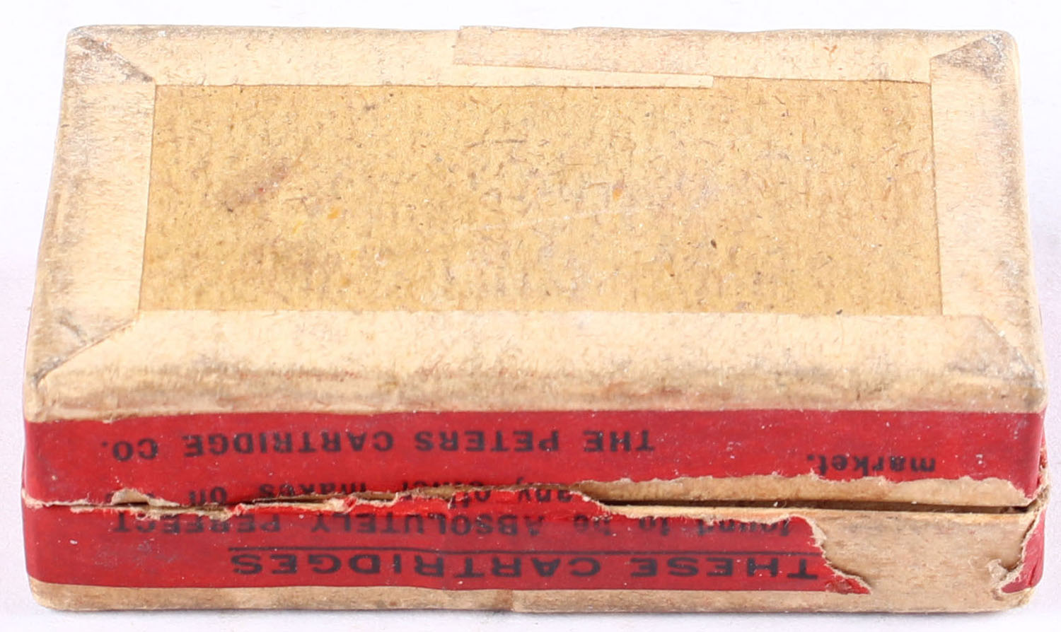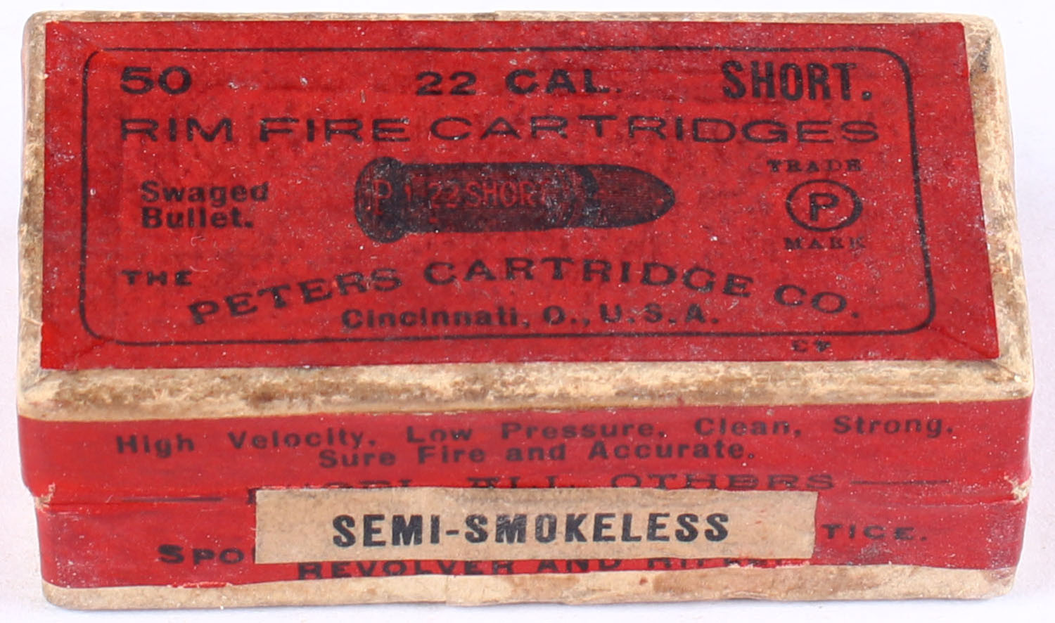 Peters, Rim Fire Cartridges, .22 Short, Semi-Smokeless, RHWeb: PCC-2 S-4, Partial 37rds., 2pc. Buff box with red top & side sealing labels, white 'Semi-Smokeless' over-label on front side, box is solid with very good to excellent color, minor age soiling, very minor edge & corner wear, end flaps are solid, ammo is good. Grade: Excellent - Value: 80 to 120