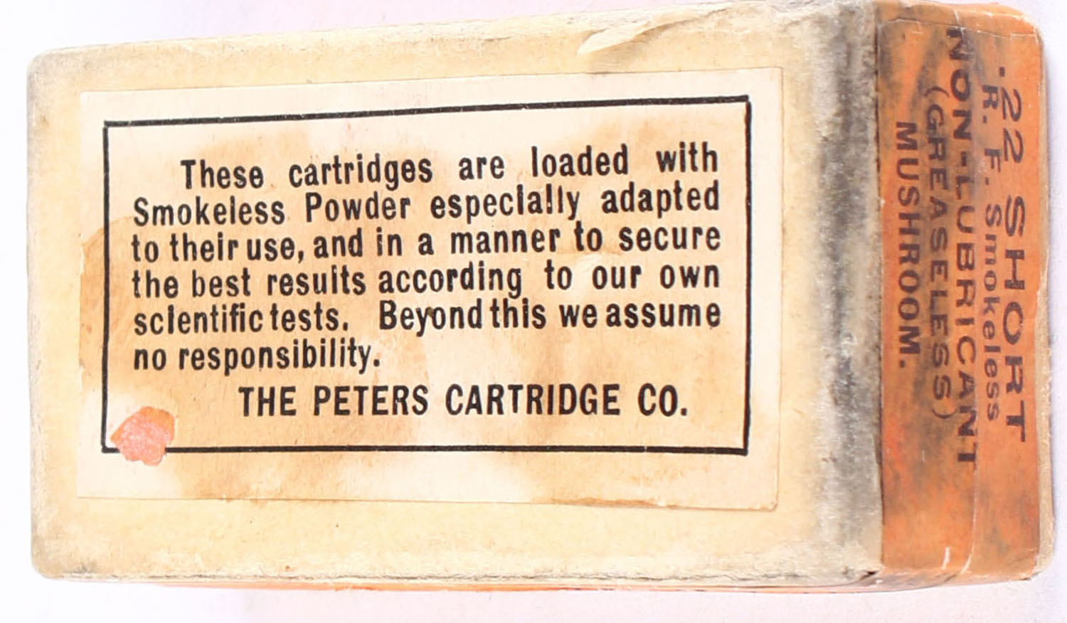 Peters, Smokeless R.F. Cartridges, .22 Short Hollow Point, Non-Lubricant (Greaseless), RHWeb: PCC-2 S-7, FULL & SEALED, 2pc. Buff box with orange top & side sealing labels, green 'Greaseless' over-stamp, box is solid with excellent color, some staining on bottom & right end, minor edge & corner wear, labels are intact. Grade: Excellent - Value: 200 to 300