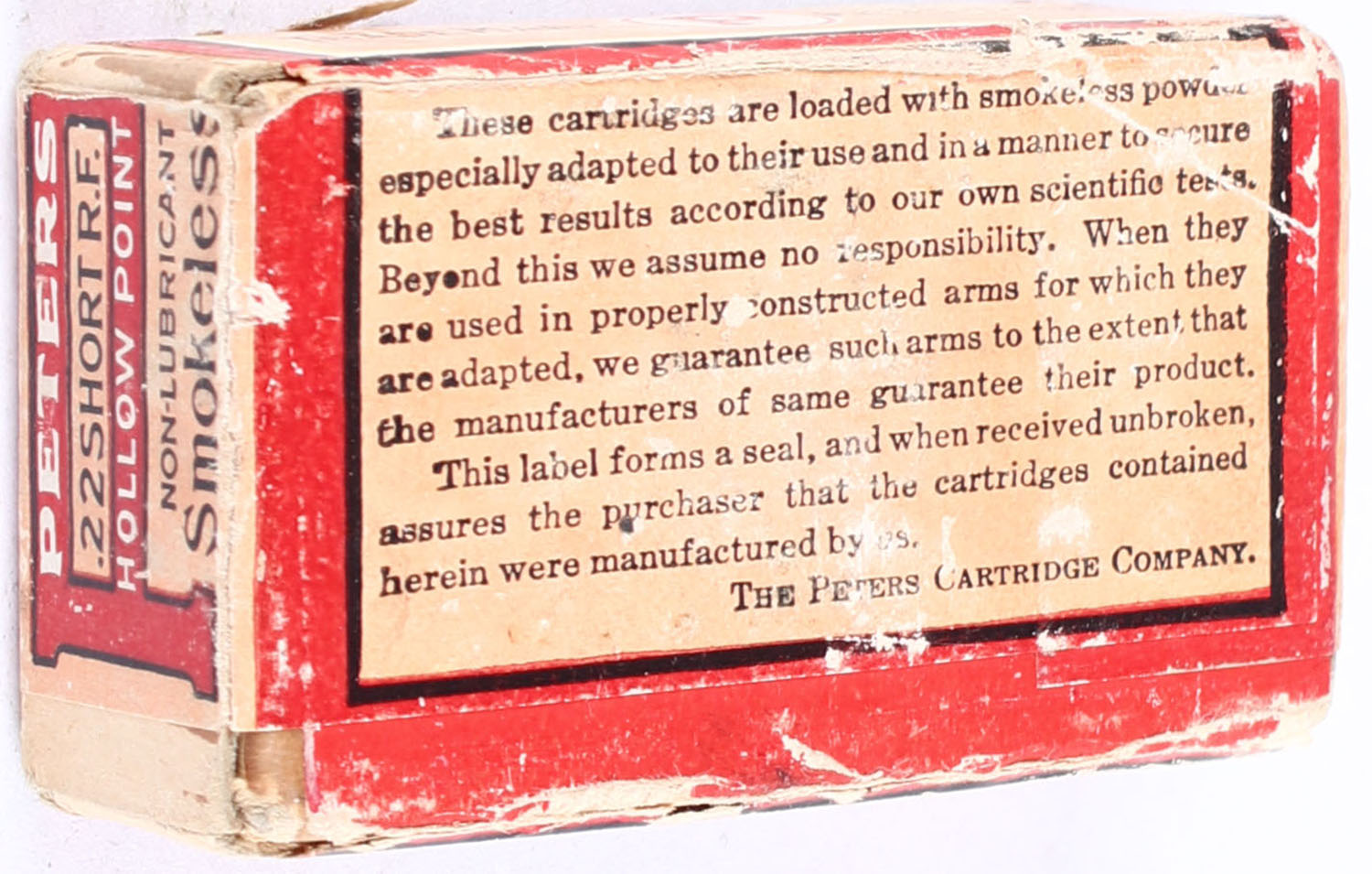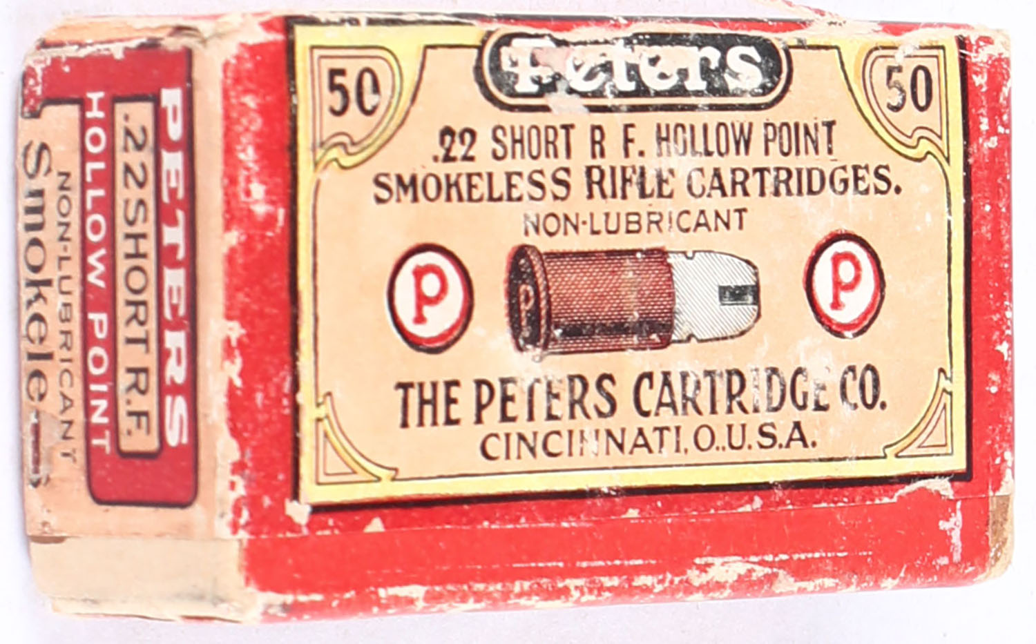 Peters, Smokeless Rifle Cartridges, .22 Short Hollow Point, Non-Lubricant, RHWeb: PCC-5A S-5, FULL & SEALED, 2pc. Buff box with salmon red & yellow full wraparound label, box is solid with excellent color, some shelf wear, minor edge & corner wear, label is intact. Grade: Very Good ++ - Value: 100 to 150