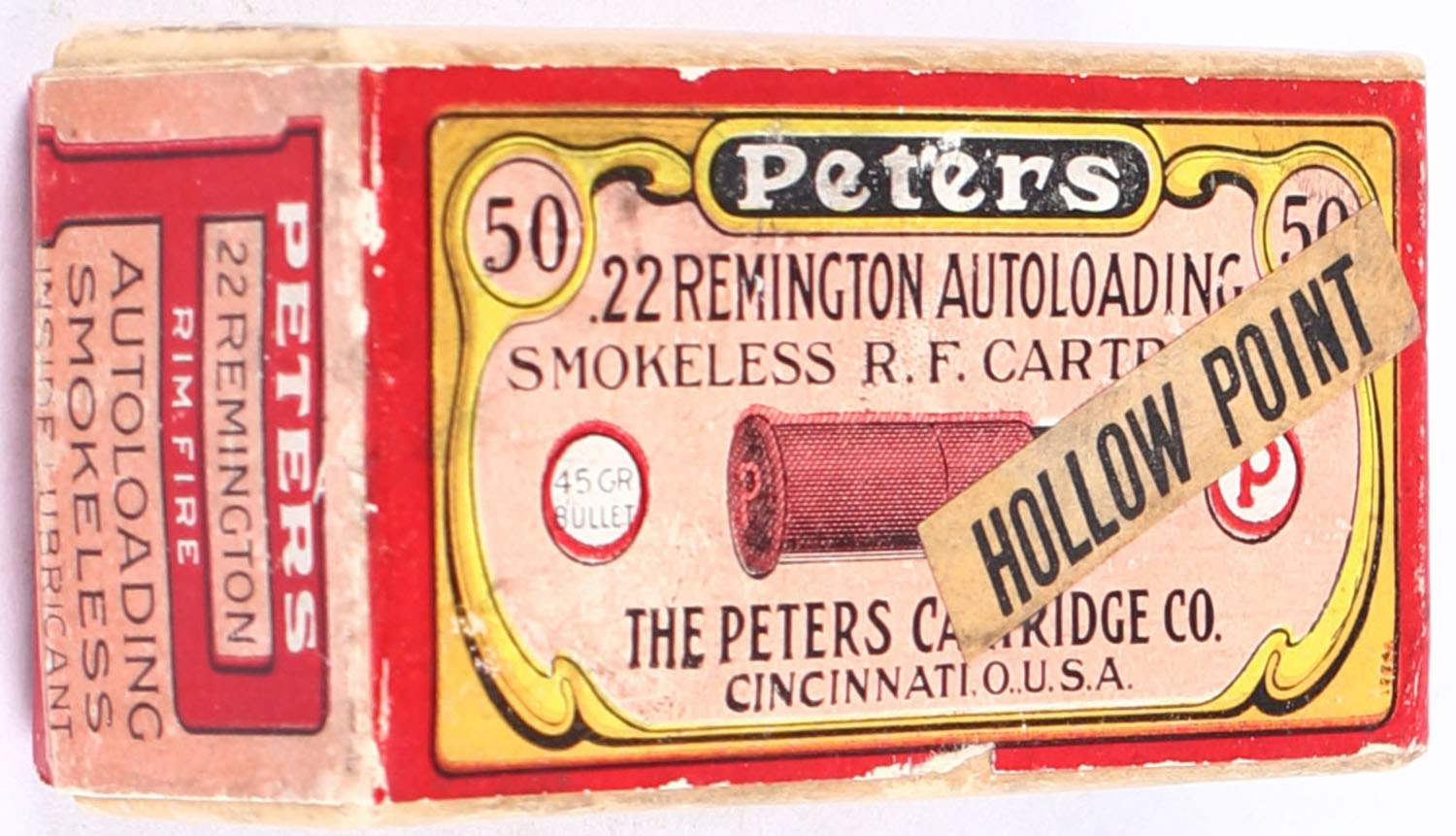 Peters, Smokeless R.F. Cartridges, .22 Remington Autoloading Hollow Point, Inside Lubricant, RHWeb: PCC-5A RA-2a, FULL & SEALED, 2pc. Buff box with salmon & red wraparound label, white 'Hollow Point' over-label, box is solid with very good to excellent color, some age soiling, minor edge & corner wear, labels are intact. Grade: Very Good ++ - Value: 300 to 450