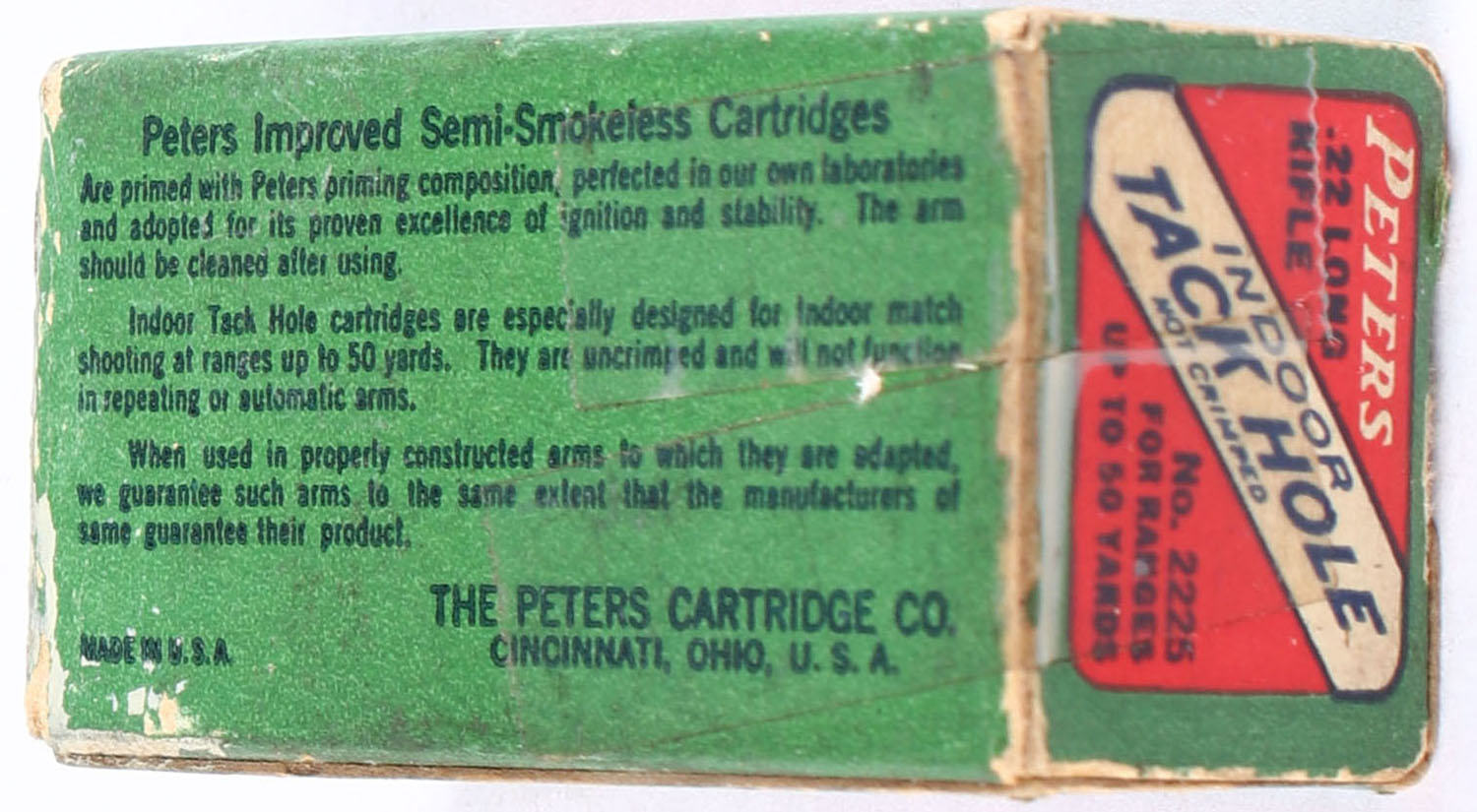 Peters, Indoor Tack Hole, .22 Long Rifle, Not Crimped, Improved Semi-Smokeless, RHWeb: PCC-52 LR-8, Full, 1pc. Red green & white box, right end flap is torn & taped, excellent color, very minor age soiling, minor corner wear, edges are mostly crisp, end flaps are solid, ammo is very good. Grade: Very Good - Value: 200 to 300