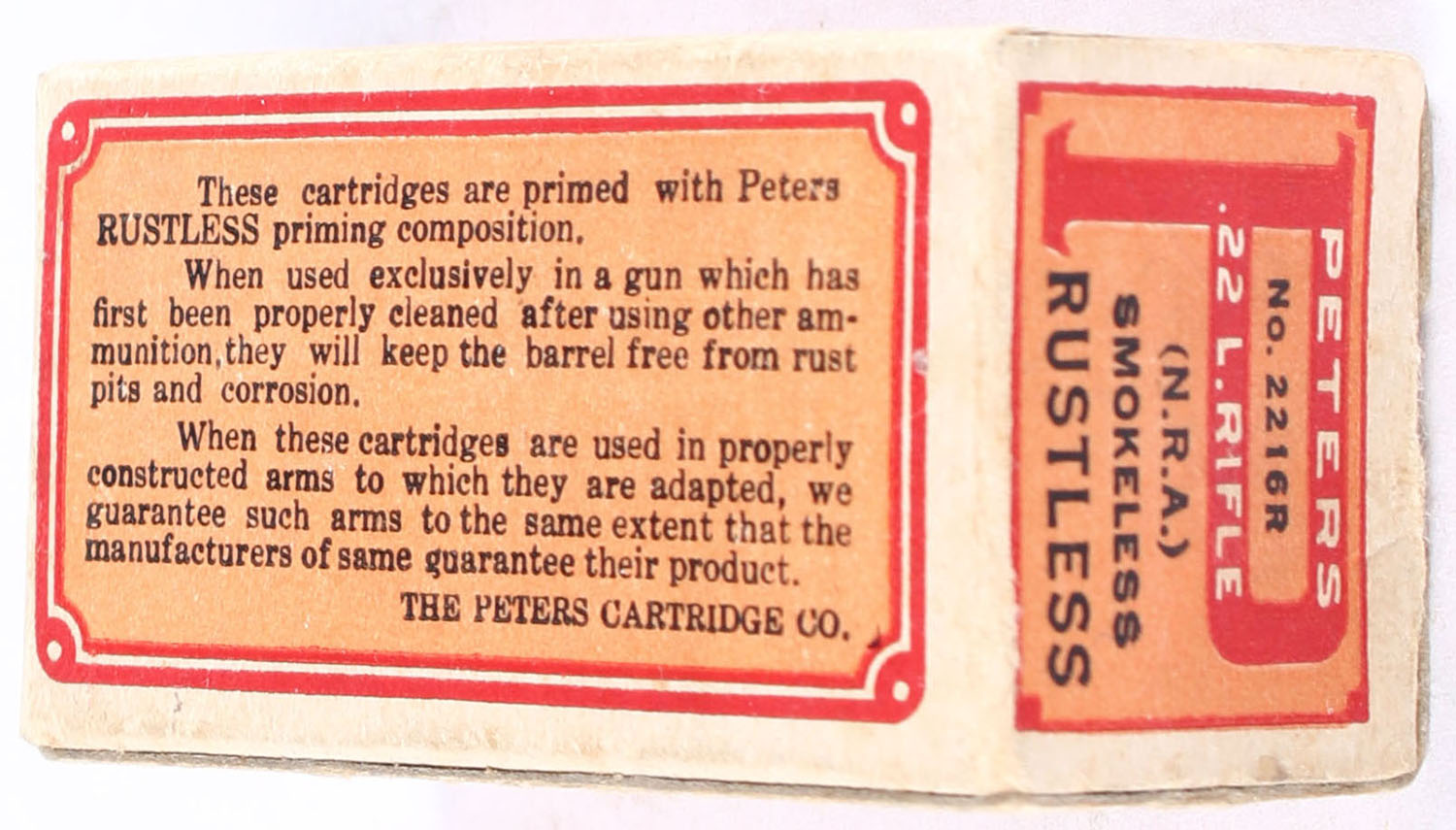 Peters, Rustless (N.R.A), .22 Long Rifle, Smokeless Powder, RHWeb: PCC-51 LR-7, Full, 1pc. Salmon red & buff box, box is solid with excellent color, minor age soiling & corner wear, very minor edge wear, end flaps are solid, ammo is very good to excellent. Grade: Excellent - Value: 100 to 150