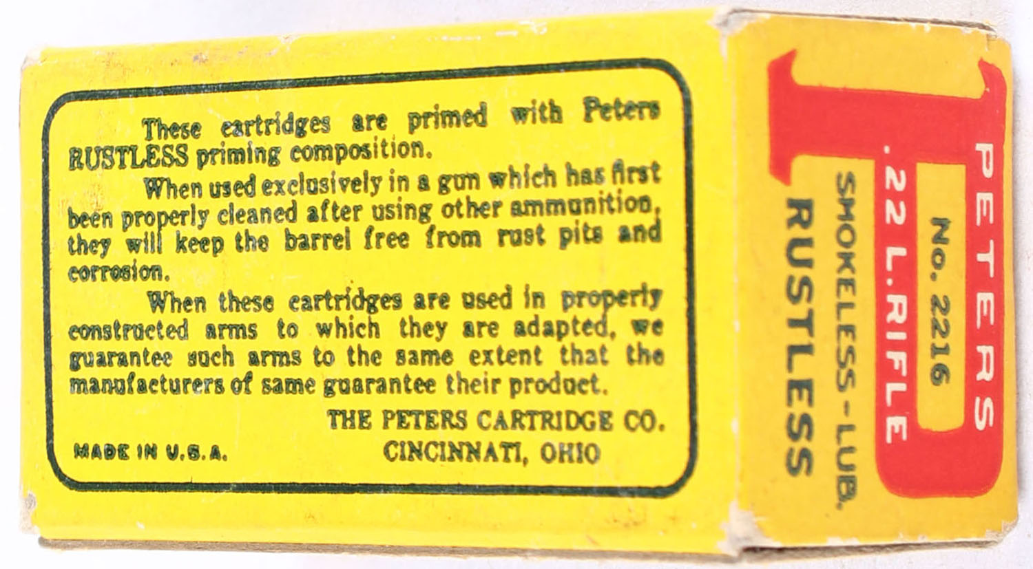 Peters, Rustless, .22 Long Rifle, Lubricated, RHWeb: PCC-8A LR-1a, Full, 1pc. Blue yellow & red box, box is near mint with minty color, only very minor corner wear, edges are mostly crisp, end flaps are solid, ammo is excellent. Grade: Excellent ++ - Value: 60 to 90