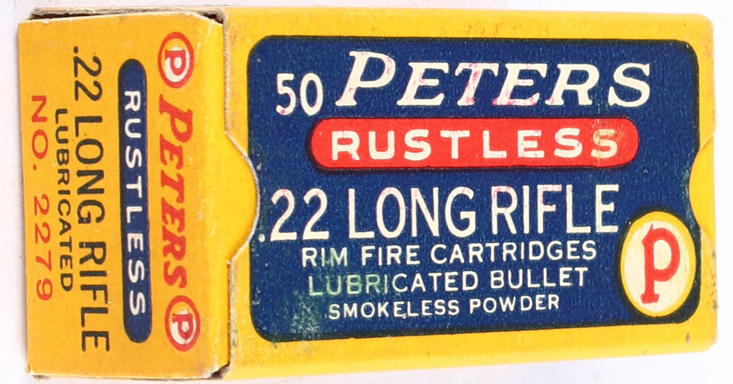 Peters, Rustless, .22 Long Rifle, Lubricated, RHWeb: PCC-8C LR-2, Full, 1pc. Blue yellow & red box, box is solid with excellent color, minor shelf wear, corners are mostly sharp, edges are crisp, end flaps are solid, ammo is excellent. Grade: Excellent - Value: 20 to 30