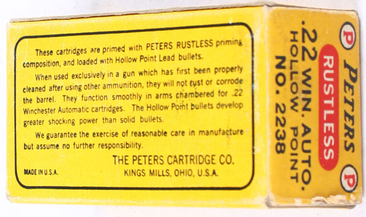 Peters, Rustless, .22 Winchester Automatic Hollow Point, Smokeless, RHWeb: PCC-8C WA-4, Partial 34rds. 1pc. Blue yellow & red box, box is solid with excellent color, crease on top, minor corner wear, very minor edge wear, end flaps are solid, ammo is excellent. Grade: Excellent - Value: 20 to 30