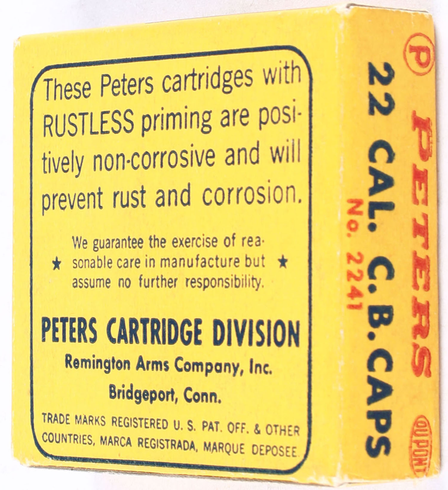 Peters, Rustless, .22 C.B. Caps, RHWeb: PCC-8D CB-1a, Full, 1pc. Blue yellow & red box, box is solid with excellent color, minor corner wear, edges are mostly crisp, end flaps are solid, ammo is excellent to minty. Grade: Excellent + - Value: 50 to 75