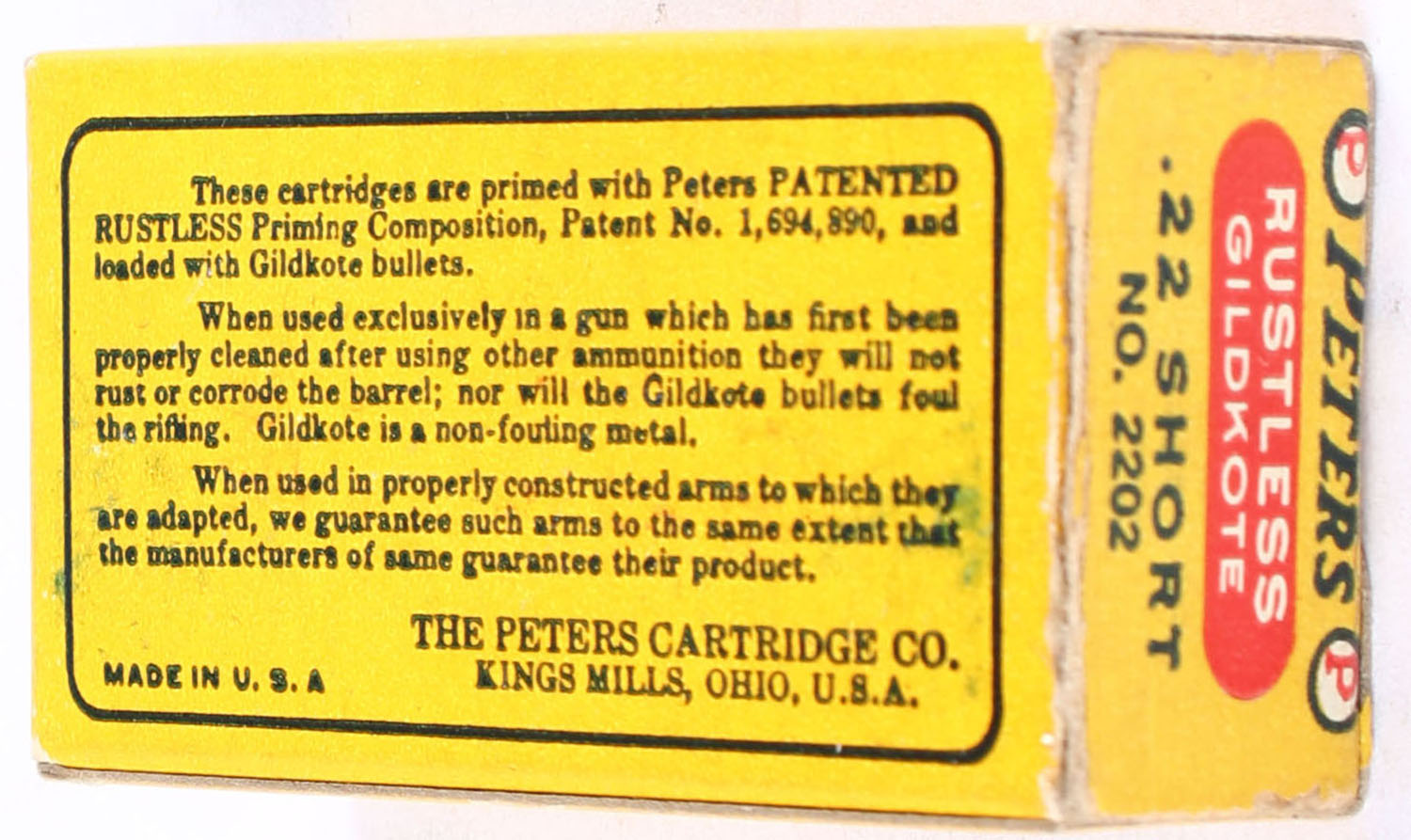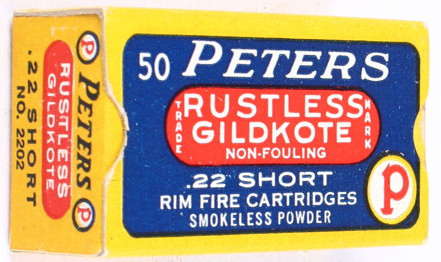 Peters, Rustless Gildkote, .22 Short, Non-Fouling, RHWeb: PCC-10 S-1a, Full, 1pc. Blue yellow & red box, box is solid with excellent to minty color, right end flap has been torn and repaired well, corners are mostly sharp, very minor edge wear, end flaps are solid, ammo is excellent. Grade: Excellent - Value: 30 to 45
