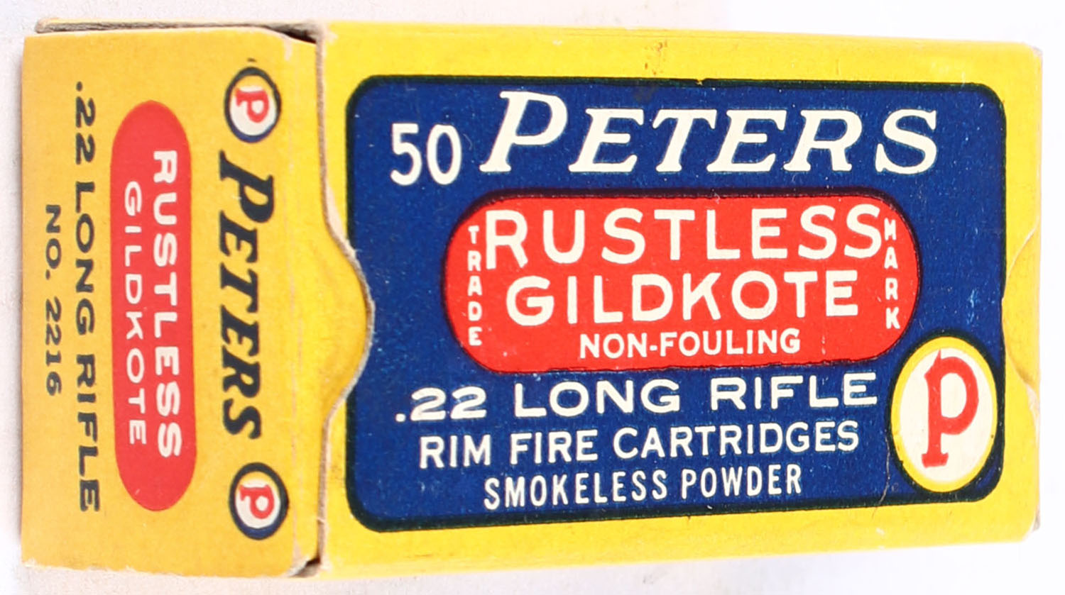 Peters, Rustless Gildkote, .22 Long Rifle, Non-Fouling, RHWeb: PCC-10 LR-1, Full, 1pc. Blue yellow & red box, box is solid with excellent color, very minor corner wear, edges are crisp, end flaps are solid, ammo is excellent. Grade: Excellent ++ - Value: 30 to 45