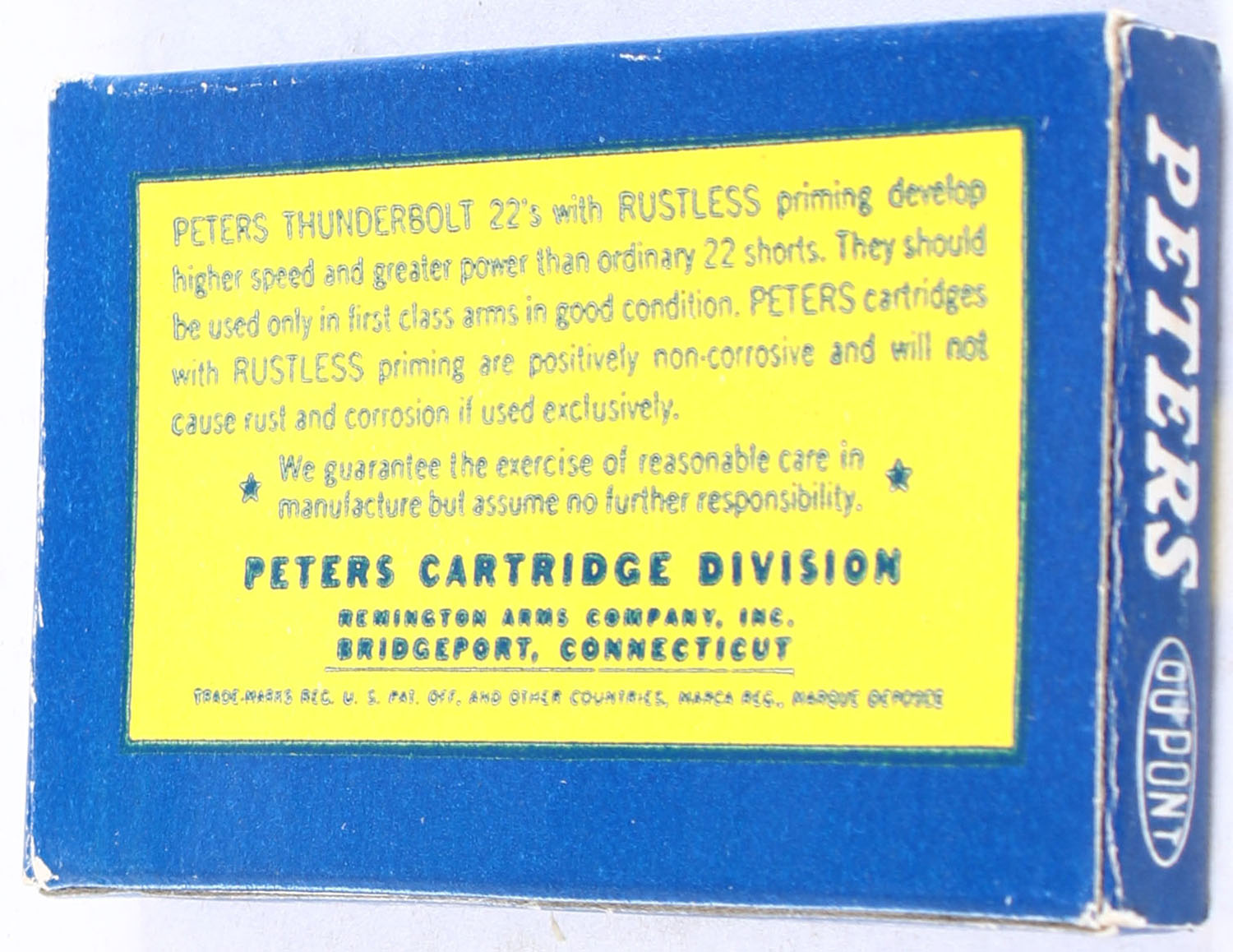 Peters, ''Thunderbolt'', .22 Short, RHWeb: PCC-17 S-5, Full, 1pc. Blue yellow & white flat pack, pack is solid with minty color, minor edge & corner wear, end flaps are solid, ammo appears minty. Grade: Excellent + - Value: 50 to 75