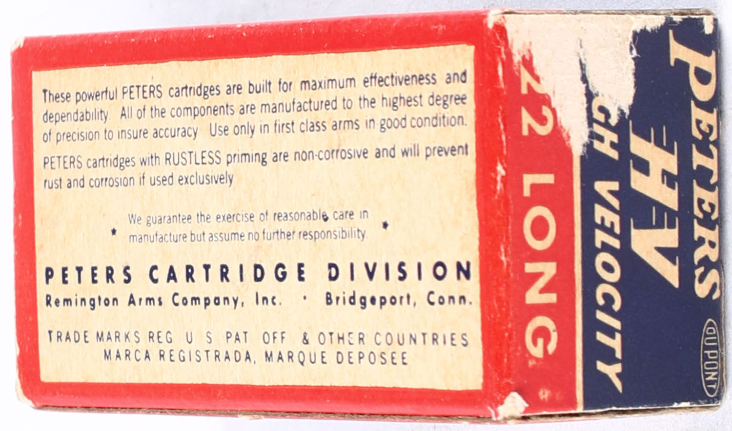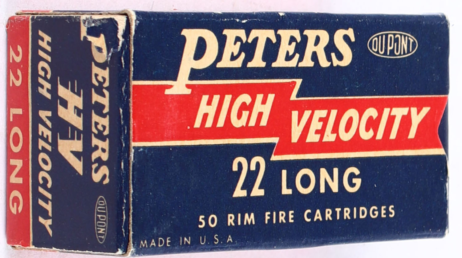 Peters, High Velocity, .22 Long, RHWeb: PCC-17 L-1c, Full, 1pc. Blue red & white box, box is solid with excellent color, very minor age soiling & corner wear, edges are crisp, end flaps are solid, ammo is excellent. Grade: Excellent - Value: 16 to 24