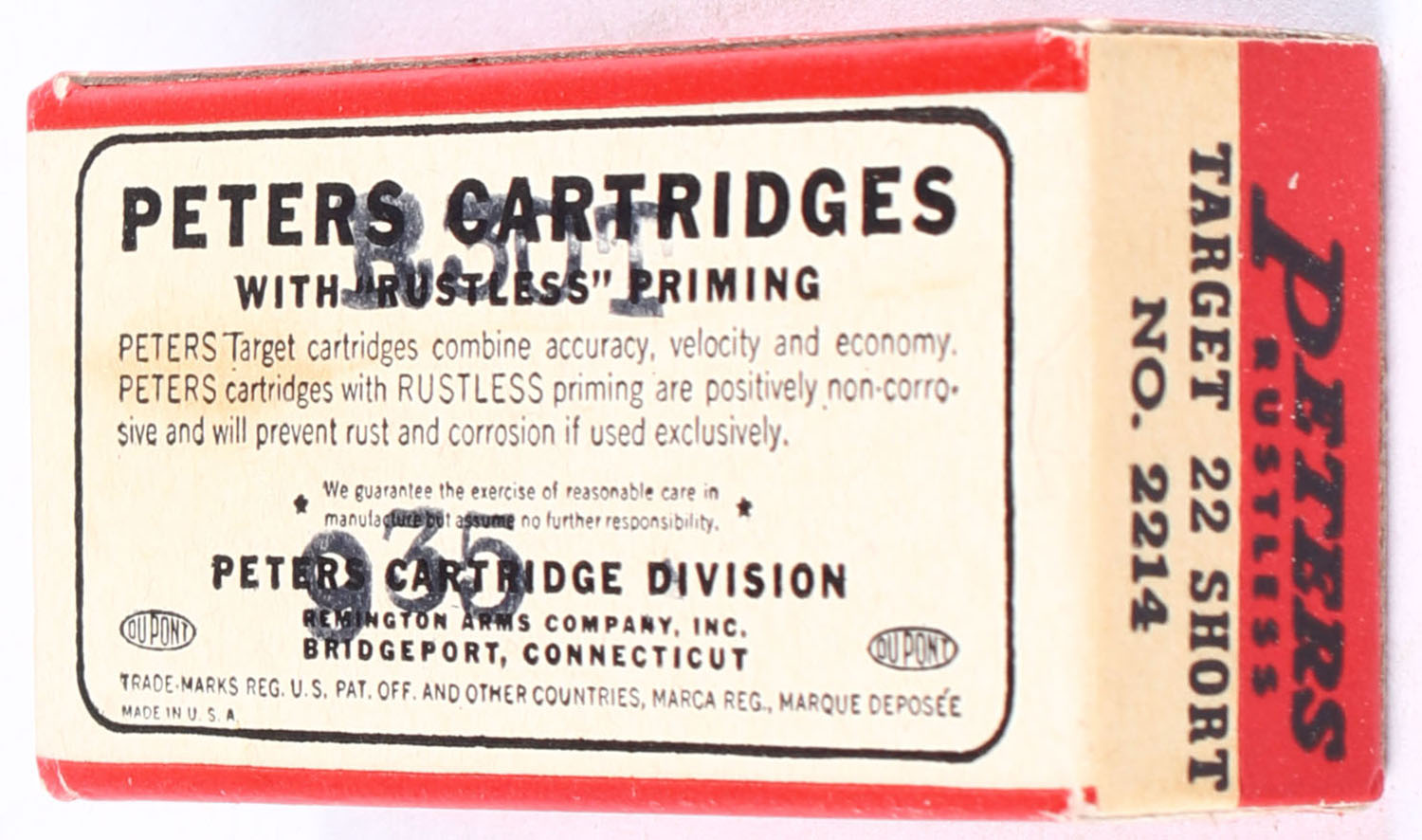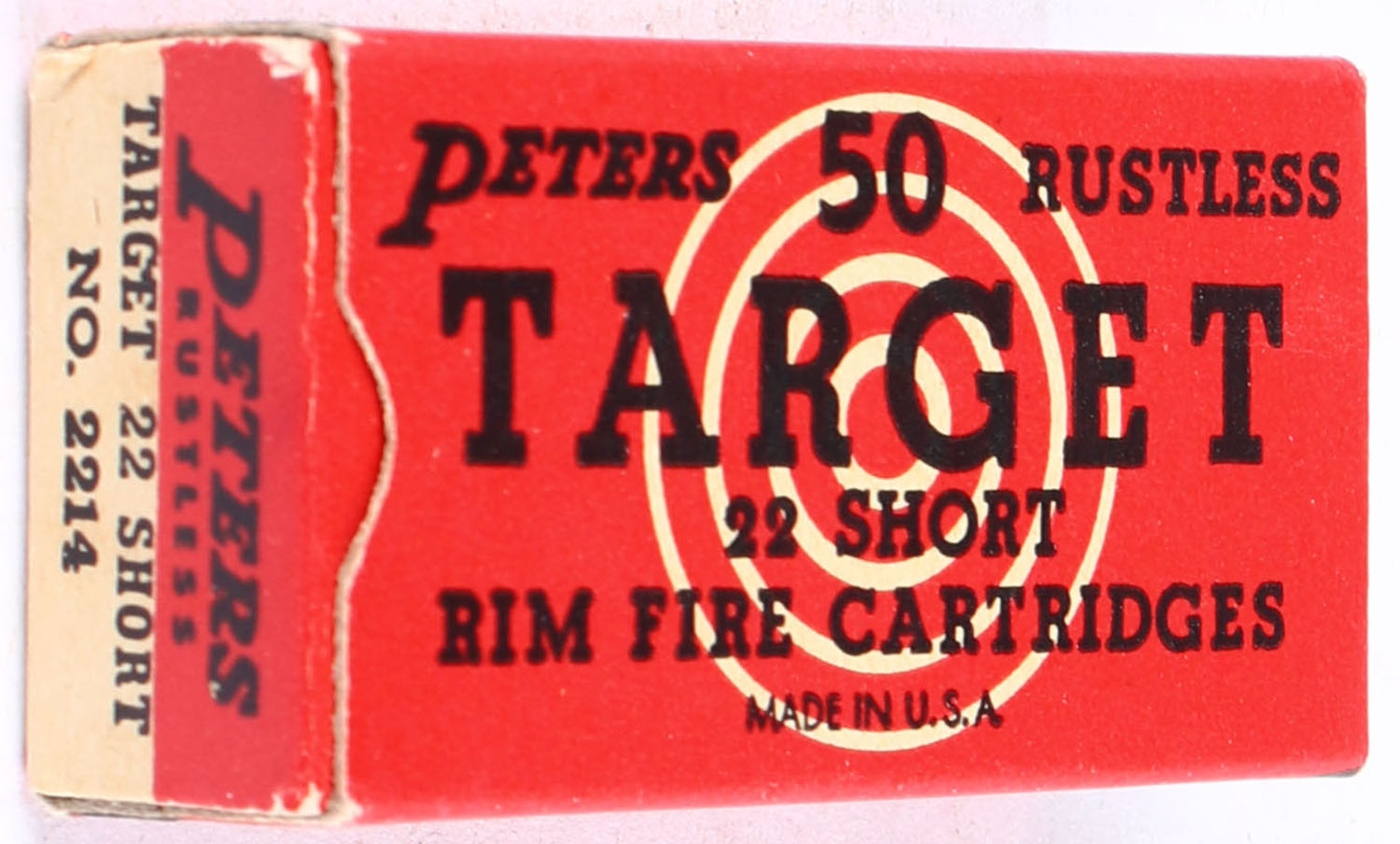 Peters, Target, .22 Short, Rustless, RHWeb: PCC-54A S-1f, Full, 1pc. Red black & white box, box is solid with excellent color, very minor corner wear, edges are crisp, end flaps are solid, ammo is excellent. Grade: Excellent + - Value: 12 to 18