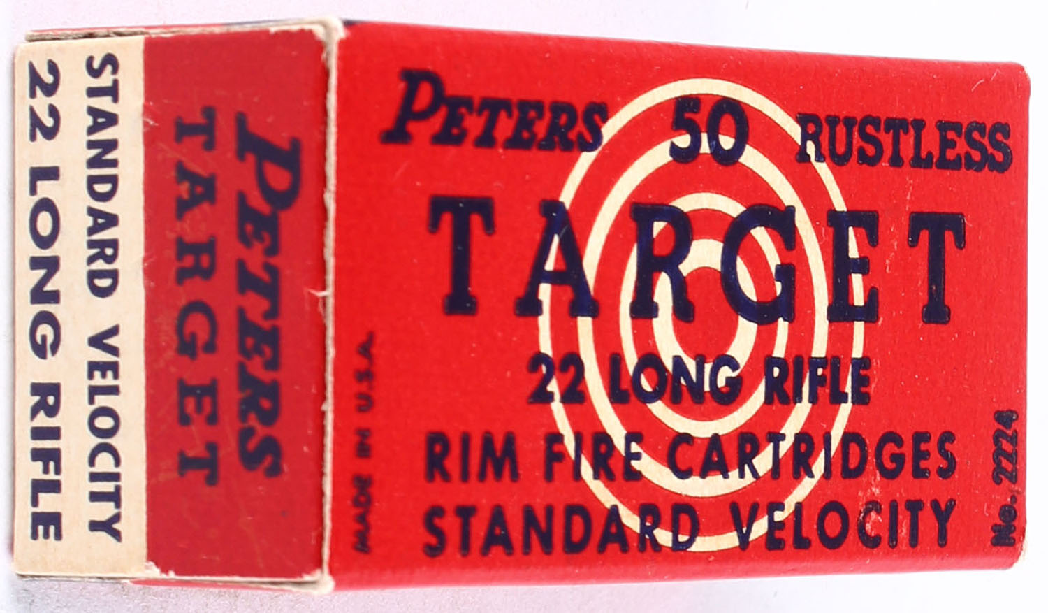 Peters, Target, .22 Long Rifle, Standard Velocity, RHWeb: PCC-54C LR-2.2d, Full, 1pc. Red black & white box, box is solid with excellent color, minor corner wear, edges are crisp, end flaps are solid, ammo is excellent. Grade: Excellent + - Value: 12 to 18