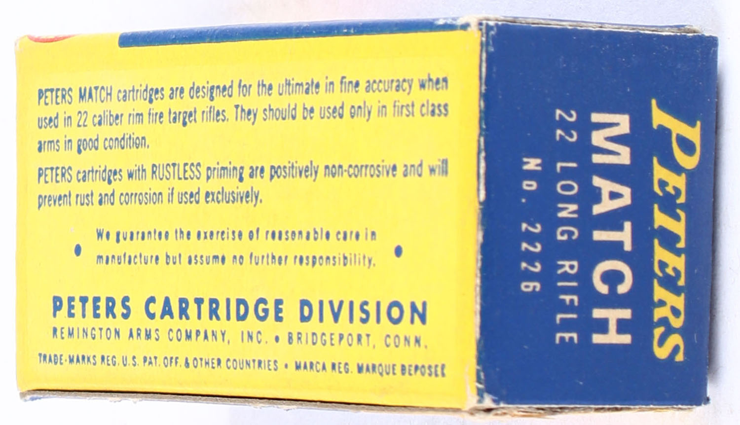 Peters, Match, .22 Long Rifle, For Rifle Shooting, RHWeb: PCC-55 LR-1d, Full, 1pc. Blue yellow & red box, box is solid with excellent color, very minor edge & corner wear, end flaps are solid, ammo is excellent. Grade: Excellent + - Value: 50 to 75