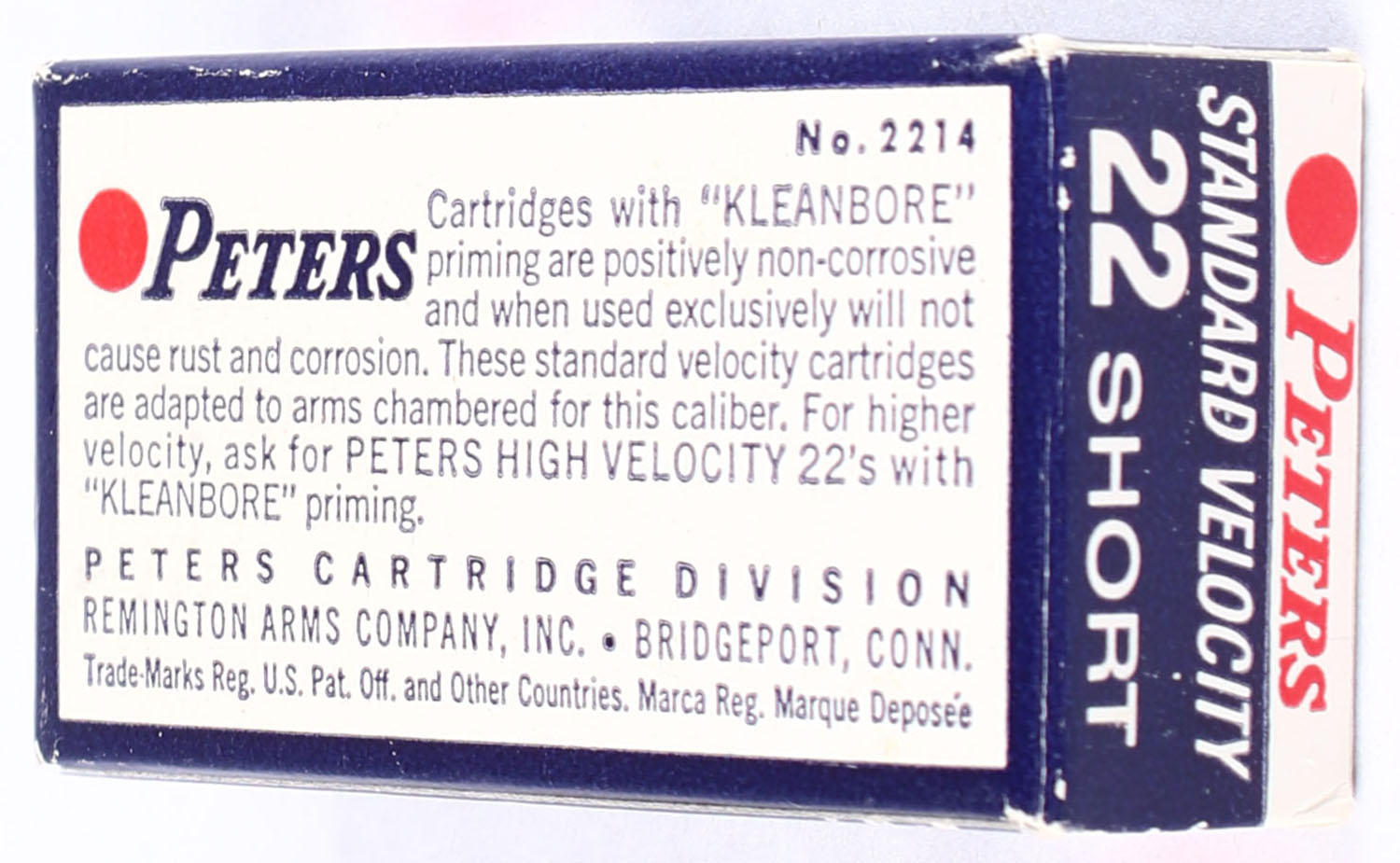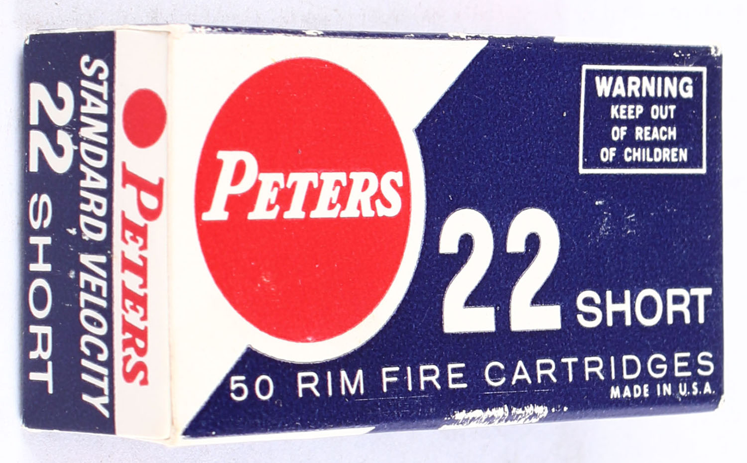 Peters, Standard Velocity, .22 Short, RHWeb: PCC-20 S-4b, Full, 1pc. Blue white & red box, box is solid with excellent to minty color, very minor edge & corner wear, end flaps are solid, ammo is very good. Grade: Excellent - Value: 12 to 18
