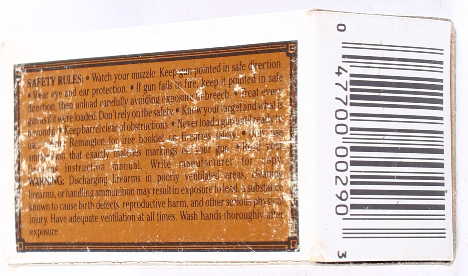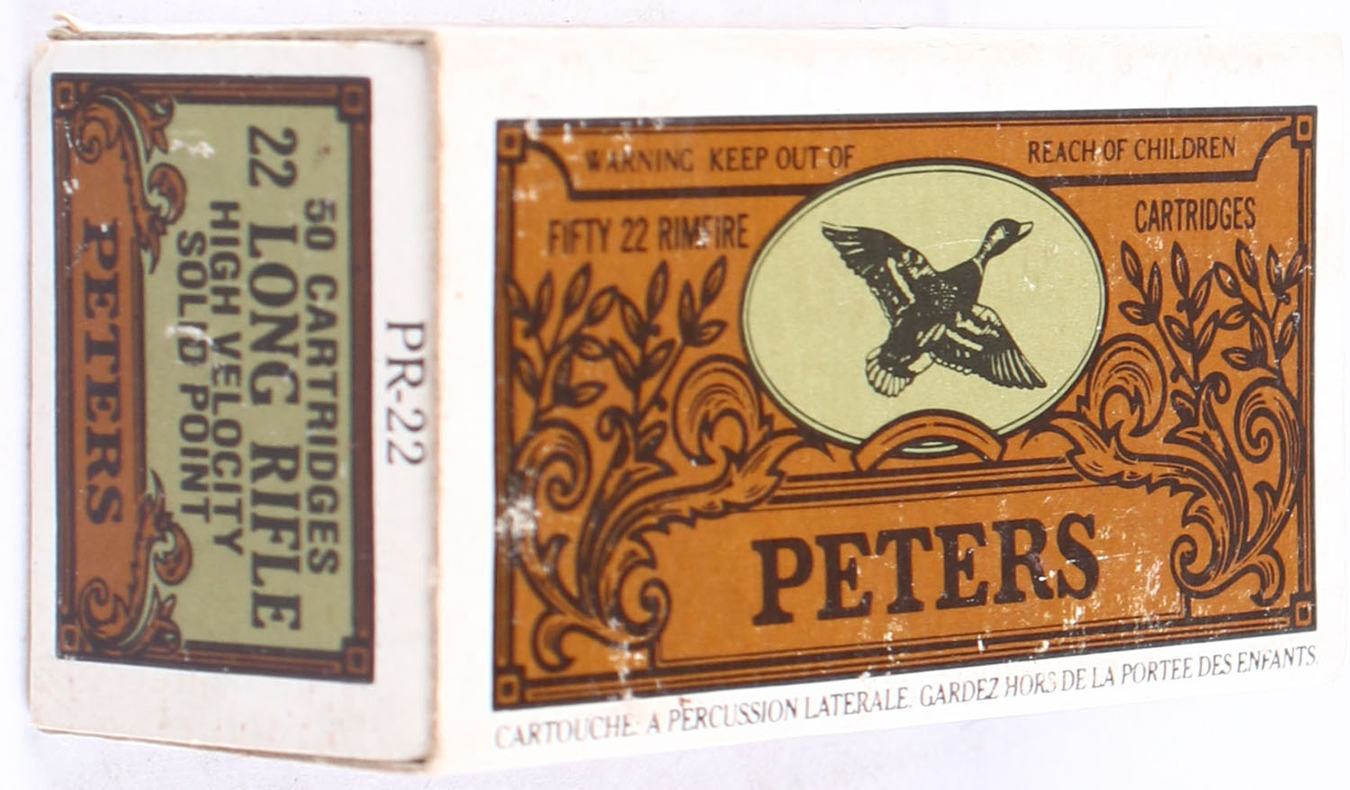 Peters, .22 Long Rifle, High Velocity, Solid Point, RHWeb: PCC-22A LR-9.1, Full, 1pc. Brown green & white antique box, box is solid with excellent color, minor shelf wear, end flaps are solid, ammo is corroded on once side of the box and ranges from good to excellent. Grade: Excellent + - Value: 6 to 10