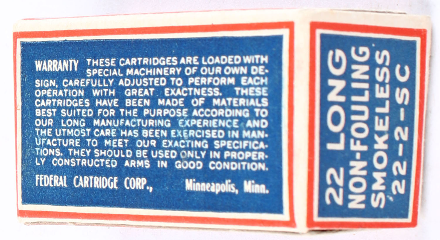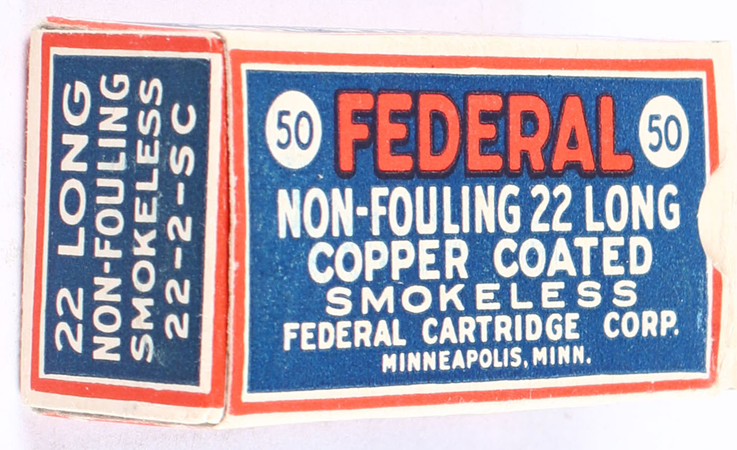 Federal, Non-Fouling Copper Coated, .22 Long, Smokeless, RHWeb: FCC-3 L-2d, Appears Full* (ammo tray is stuck), 1pc. Blue red & buff box, box is solid with excellent to minty color, only very minor corner wear, left end flap is solid, right end flap insert tab is flimsy, from the ammo I can see - it does appear to be correct and in excellent condition. Grade: Excellent - Value: 220 to 330