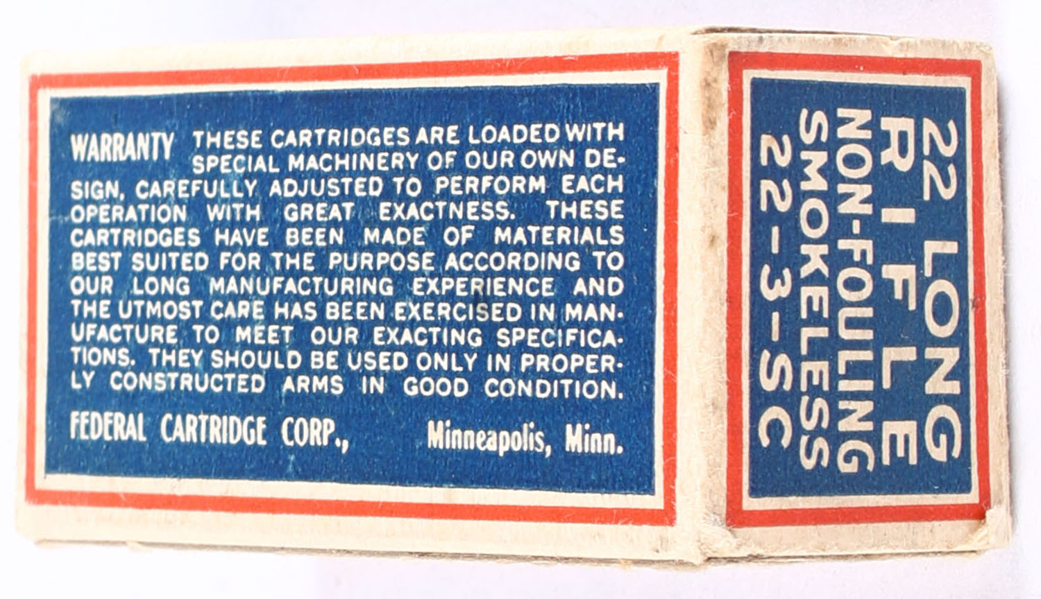 Federal, Non-Fouling Copper Coated, .22 Long Rifle, Smokeless, RHWeb: FCC-3 LR-2b (''C'' Bottom), Full, 1pc. Blue red & buff box, box is solid with excellent color, very minor age soiling & edge wear, minor corner wear, end flaps are solid, ammo is excellent. Grade: Excellent - Value: 100 to 150