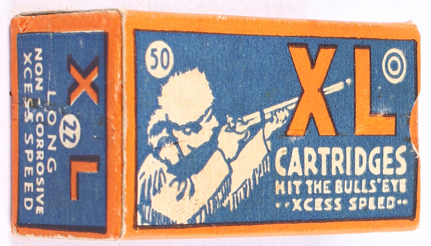 Federal, XL Cartridges, .22 Long, RHWeb: FCC-4.1 L-1 (with #4 end flap), Full, 1pc. Blue orange & white box, box is solid with excellent color, minor age soiling, corners are mostly sharp, edges are crisp, end flaps are solid, ammo is excellent. Grade: Excellent - Value: 220 to 330