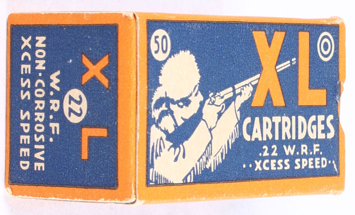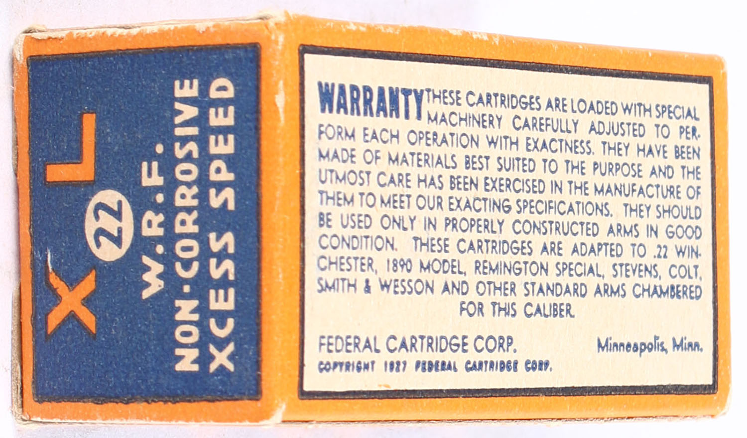 Federal, XL Cartridges, .22 Winchester Rim Fire, RHWeb: FCC-4.1 WRF-1a, Full, 1pc. Blue orange & white box, box is solid with excellent color, very minor age soiling & edge wear, minor corner wear, end flaps are solid, ammo is excellent. Grade: Excellent - Value: 80 to 120