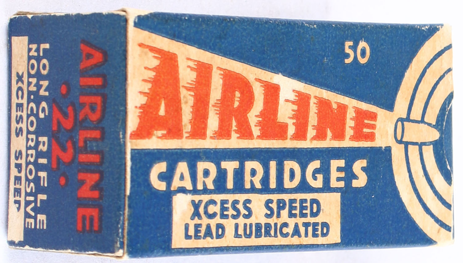 Federal, Airline Cartridges, .22 Long Rifle, Xcess Speed Lead Lubricated, RHWeb: 4.3 LR-9b, Full, 1pc. Blue white & red box, box is solid with very good color, some age soiling, very minor corner wear, edges are crisp, end flaps are solid, ammo is excellent. Grade: Very Good ++ - Value: 30 to 45