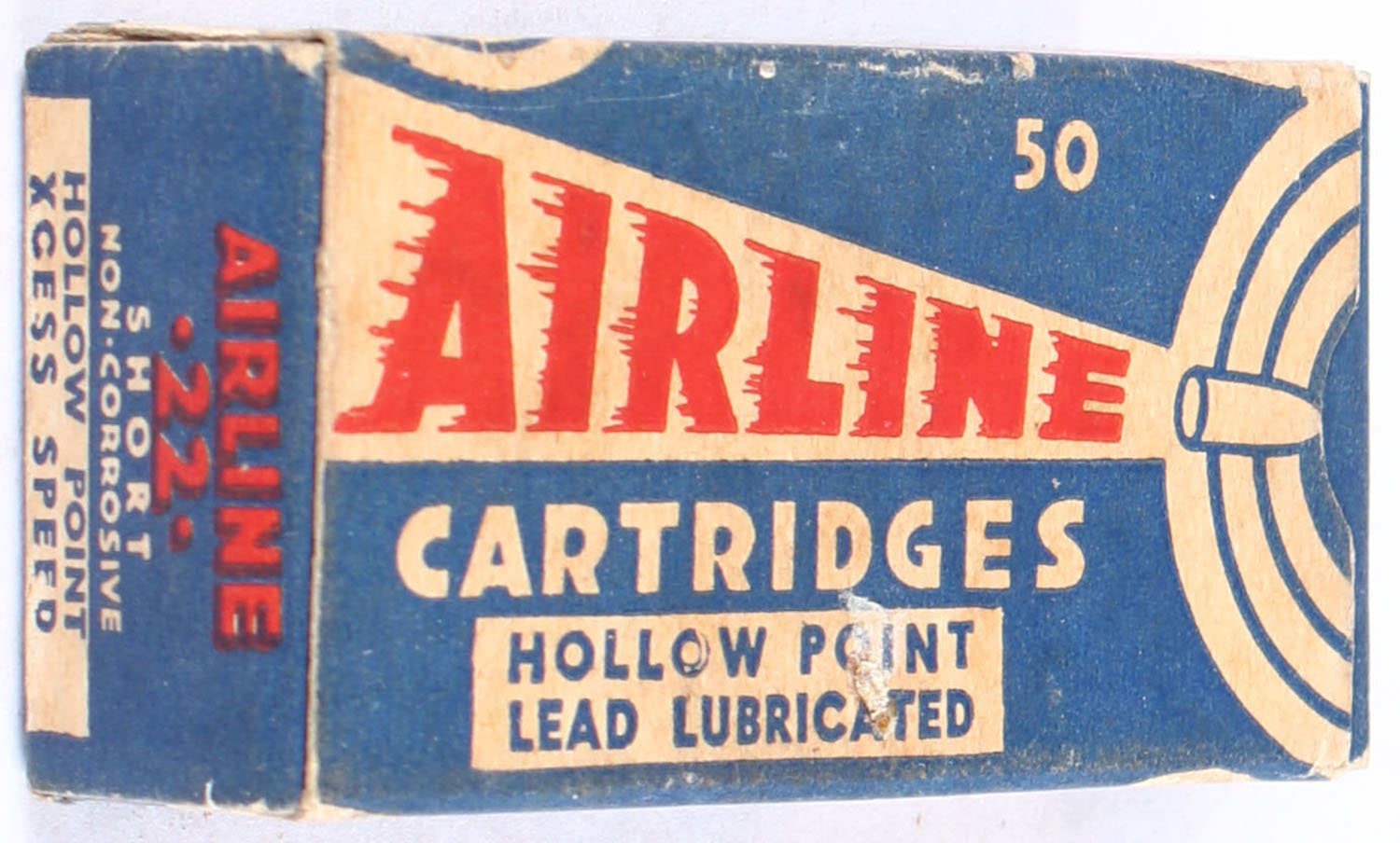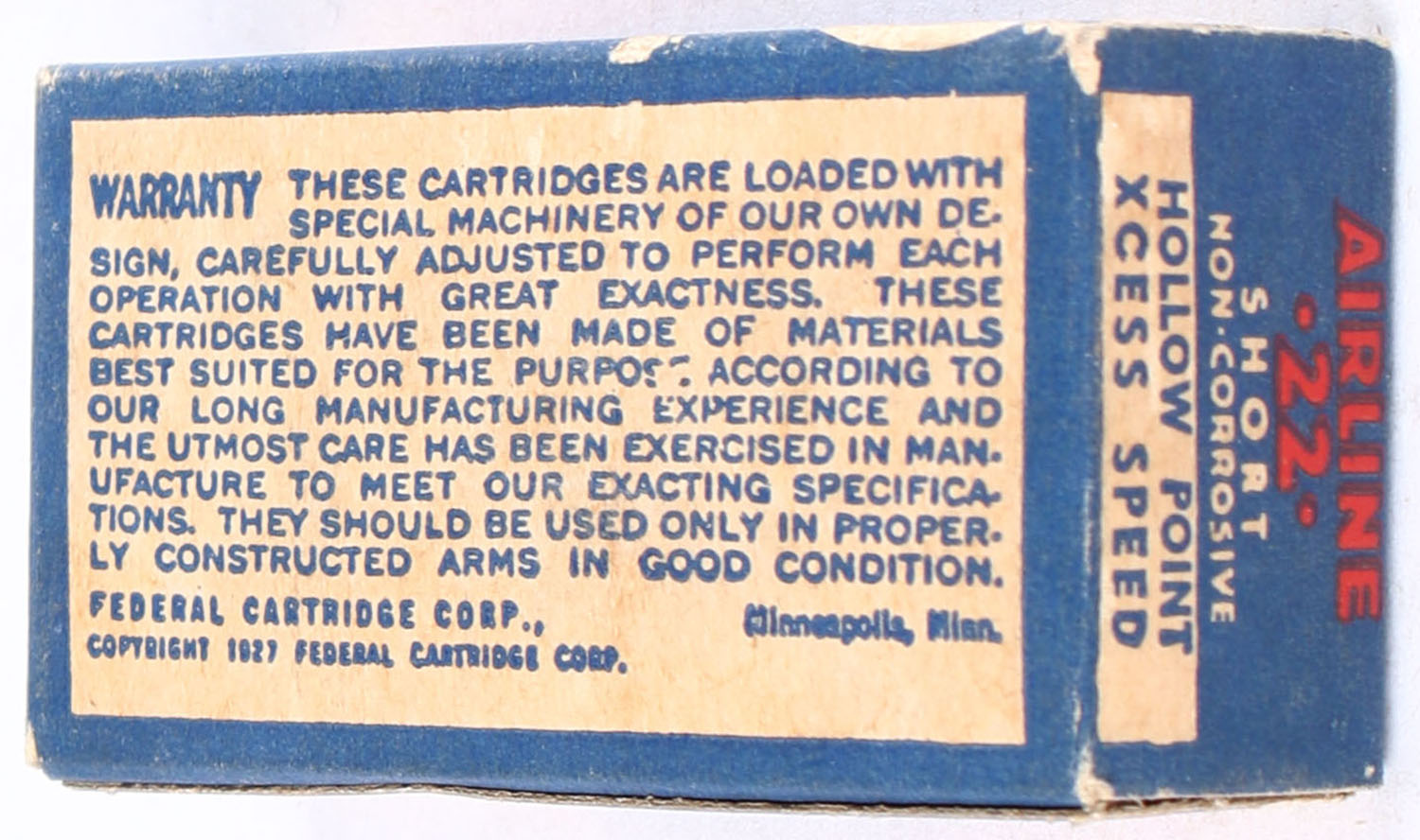 Federal, Airline Cartridges, .22 Short Hollow Point, Lead Lubricated, RHWeb: FCC-4.3 S-10, Full, 1pc. Blue white & red box, box is solid with very good color, some age soiling, minor corner wear, edges are mostly crisp, end flaps are solid, ammo is excellent. Grade: Very Good ++ - Value: 150 to 225
