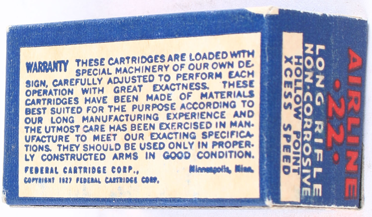 Federal, Airline Cartridges, .22 Long Rifle Hollow Point, RHWeb: FCC-4.3 LR-10b, Full, 1pc. Blue white & red box, box is solid with excellent color, minor age soiling, very minor corner wear, edges are crisp, end flaps are solid, ammo is excellent. Grade: Excellent + - Value: 50 to 75