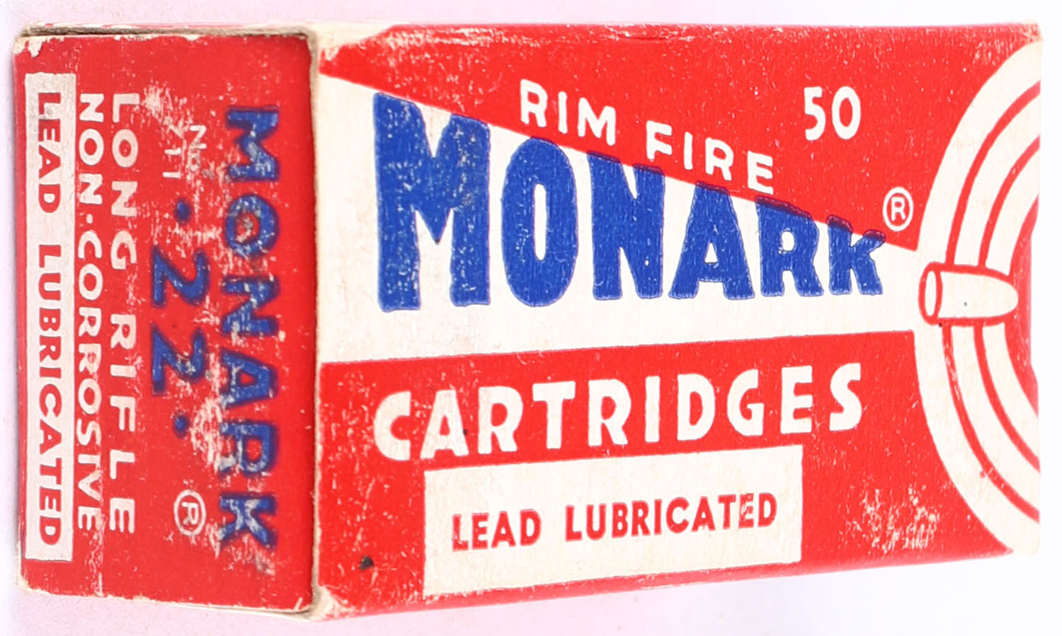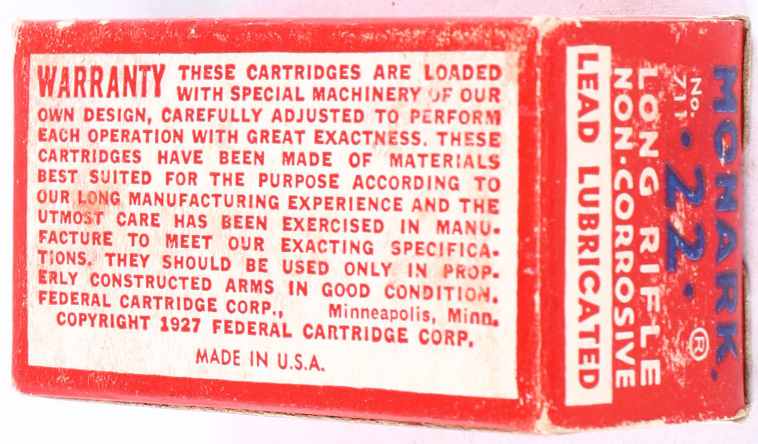 Federal, Monark Cartridges, .22 Long Rifle, Lead Lubricated, RHWeb: FED-6 LR-4f (FCC-1342), Full, 1pc. Red white & blue box, box is solid with excellent color, some shelf wear, very minor edge & corner wear, end flaps are solid, ammo is excellent. Grade: Very Good ++ - Value: 12 to 18