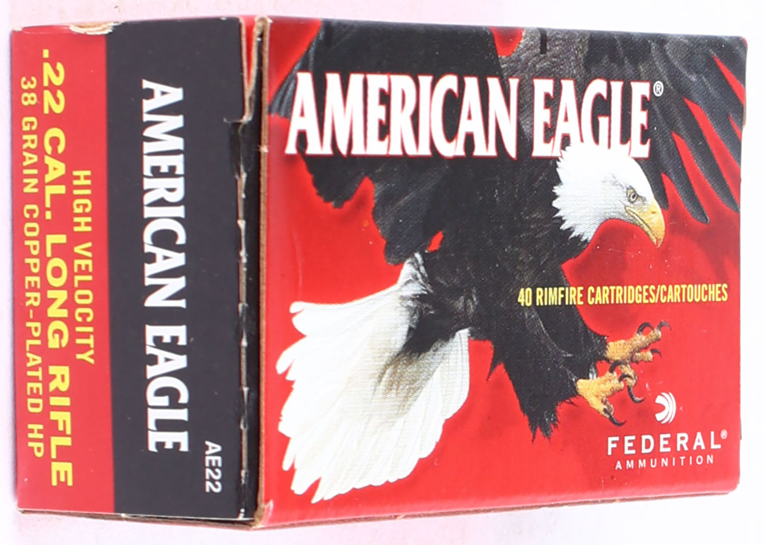 Federal, American Eagle, .22 Long Rifle, 38 Grain Copper-Plated Hollow Point, Full, 1pc. Red & black box, box is MINT with minty color, corners are sharp, edges are crisp, end flaps are solid, ammo is mint. Grade: MINT - Value: 4 to 10