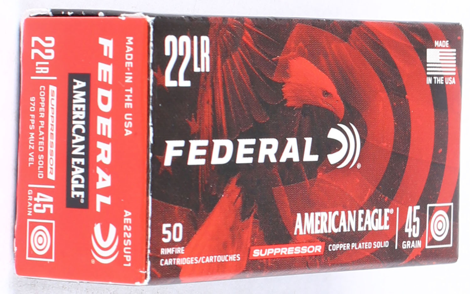 Federal, American Eagle Suppressor, .22 Long Rifle, 45 Grain Copper Plated Solid, 970 FPS, Not in RHWeb, Full, 1pc. Red black & white box, box is MINT with minty color, corners are sharp, edges are crisp, end flaps are solid, ammo is minty. Grade: MINT - Value: 10 to 15