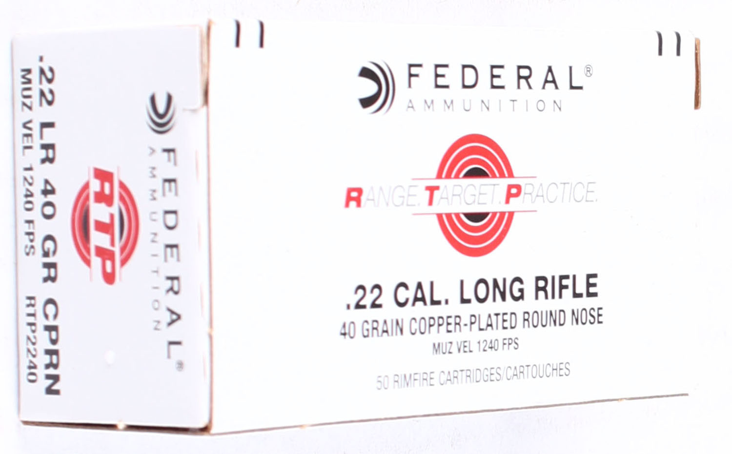 Federal, Range Target Practice, .22 Long Rifle, 40 Grain Copper Plated Round Nose, 1240 FPS, Not in RHWeb, Full, 1pc. White box with black & red printing, box is MINT with minty color, corners are sharp, edges are crisp, end flaps are solid, ammo is minty. Grade: MINT - Value: 10 to 15