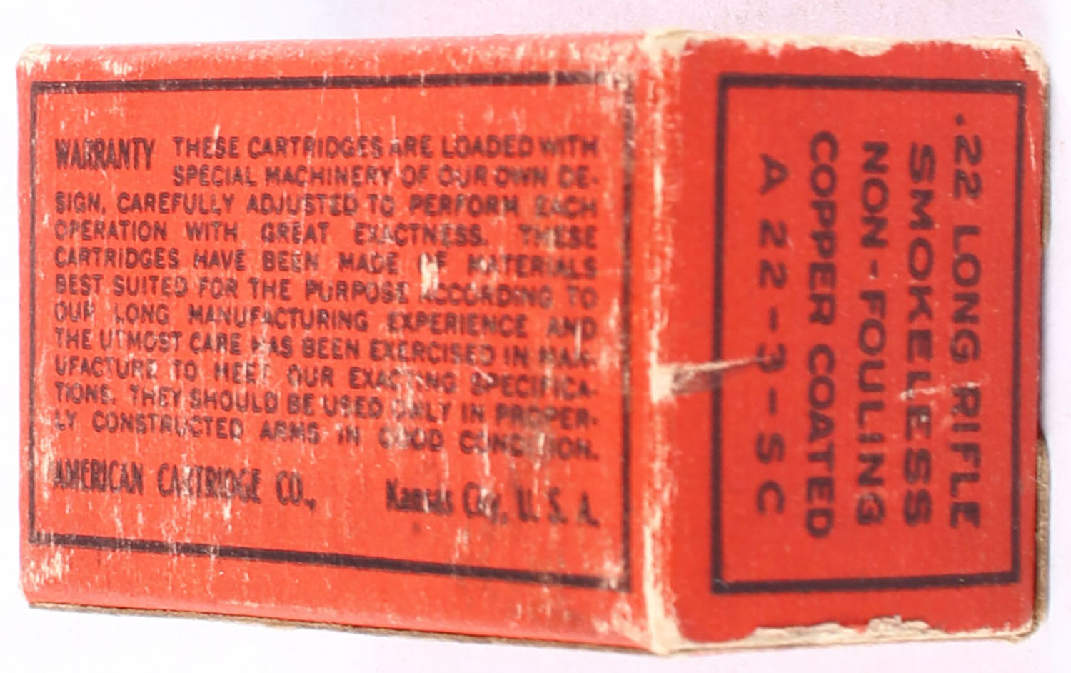 American, American Eagle, .22 Long Rifle, Copper Coated, Non-Fouling, RHWeb: ACC-1 LR-2a, Partial 48rds. 1pc. Red black & white box, left end flap is torn, very good color, minor age soiling, some edge & corner wear, right end flap is solid, ammo is excellent. Grade: Very Good - Value: 10 to 15
