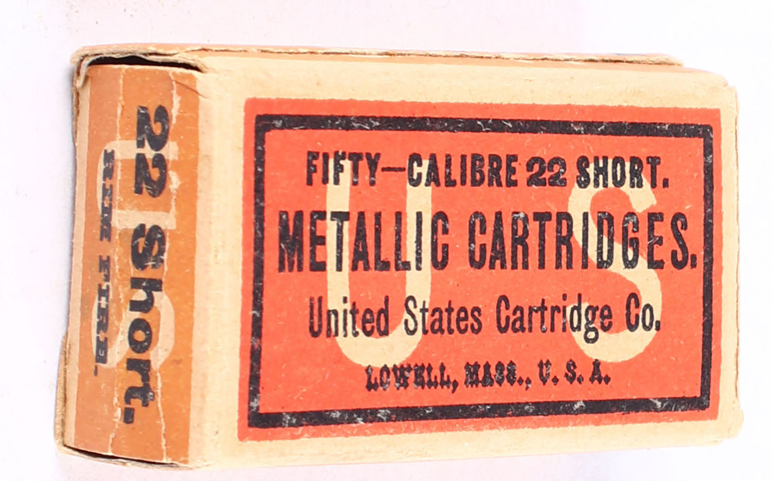 U.S., Metallic Cartridges, .22 Short, Target Cartridges, RHWeb: US-5 S-1, Partial 27rds. 1pc. Red orange & buff box, box is torn down the middle lengthwise on front & back sides, front & back have been taped on the inside of the box, very minor shelf & corner wear, edges are mostly crisp, ammo is very good. Grade: Good - Value: 20 to 30