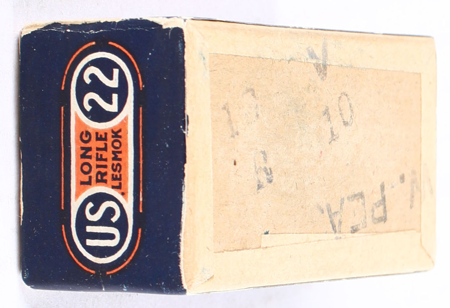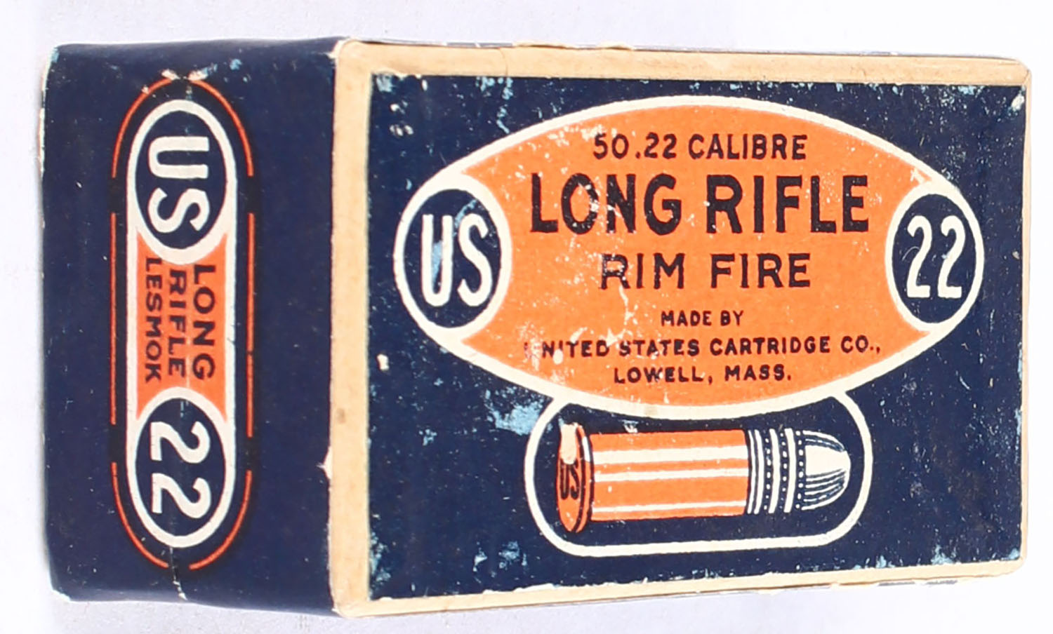 U.S., Rim Fire, .22 Long Rifle, Lesmok, RHWeb: US-7 LR-1, FULL & SEALED, 2pc. Buff box with blue/orange top & side sealing labels, box is solid with excellent color, minor shelf wear, very minor edge & corner wear, labels are intact. Grade: Excellent - Value: 50 to 75