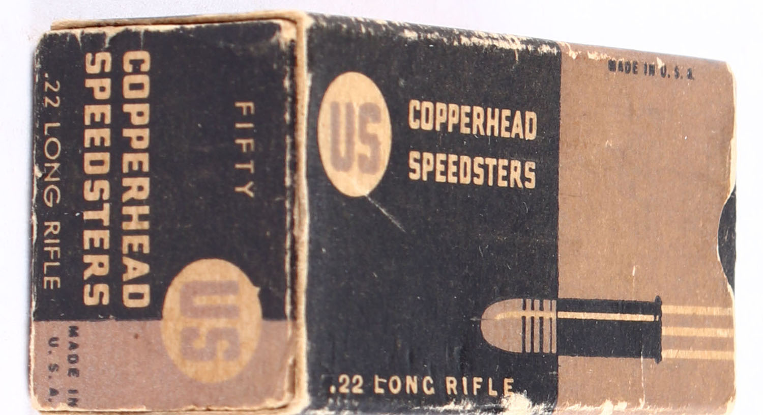 U.S., Copperhead Speedsters, .22 Long Rifle, RHWeb: US-13 LR-1c, Full, 1pc. Black & brown box, box is solid with very good color, minor age soiling, some edge & corner wear, end flaps are solid, ammo is excellent. Grade: Very Good + - Value: 16 to 50