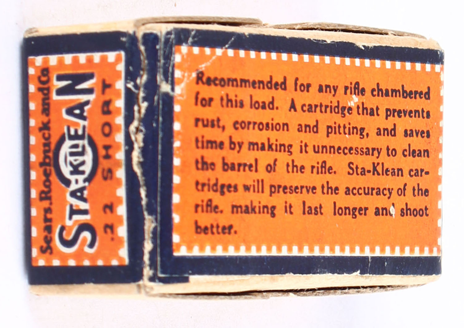 Sears, Sta-Klean, .22 Short, RHWeb: SEARS-1 S-1, Full, 2pc. Buff box with orange & blue wraparound label, box is solid with excellent to minty color, very minor corner wear, edges are crisp, end flaps are solid, ammo is excellent to minty. Grade: Excellent ++ - Value: 40 to 60