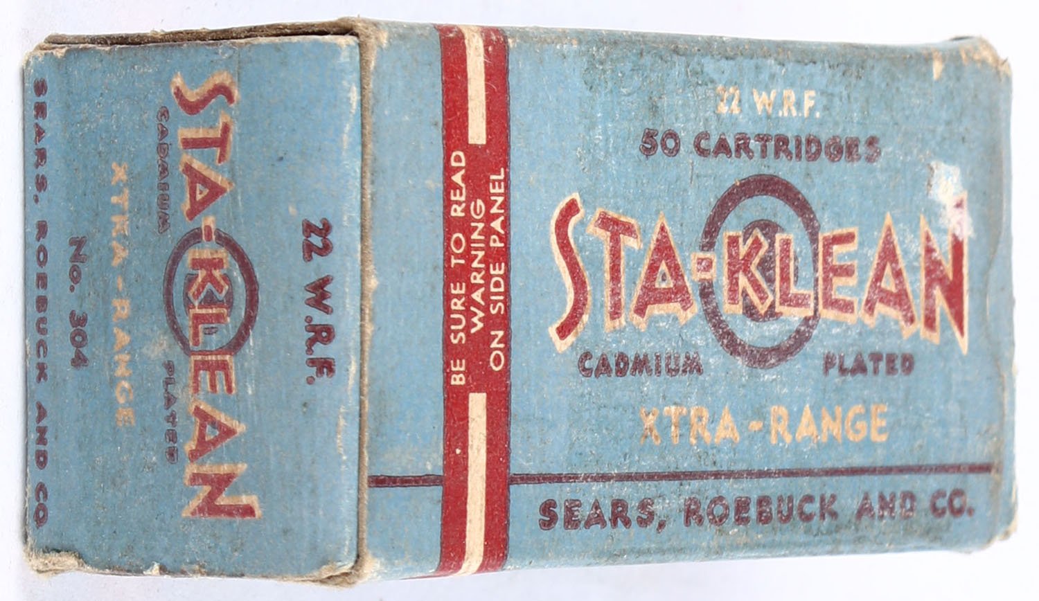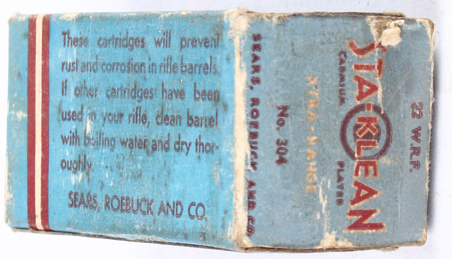 Sears, Sta-Klean Cadmium Plated, .22 W.R.F., RHWeb: Sears-4 WRF-1b, Full, 1pc. Blue maroon & white box, box is solid with very good color, some age soiling & shelf wear, minor corner wear, very minor edge wear, end flaps are solid, ammo is very good. Grade: Very Good - Value: 20 to 30
